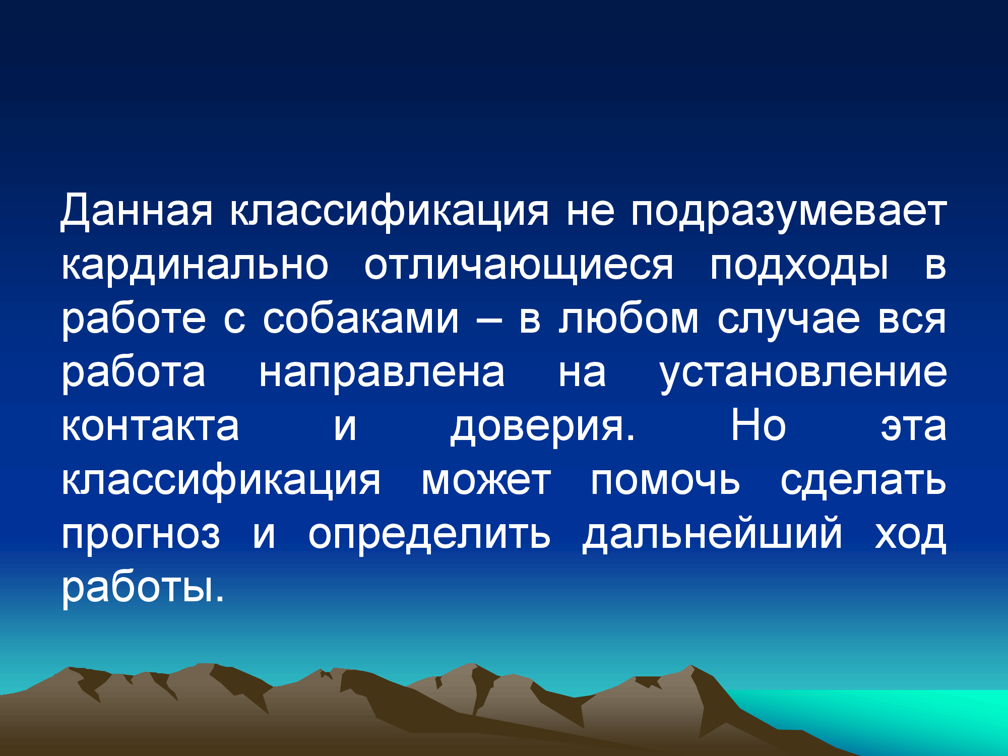 Данная классификация не подразумевает кардинально отличающиеся подходы в работе с собаками – в любом случае вся работа направлена на установление контакта и доверия.Но эта классификация может помочь сделать прогноз и определить ход работы.