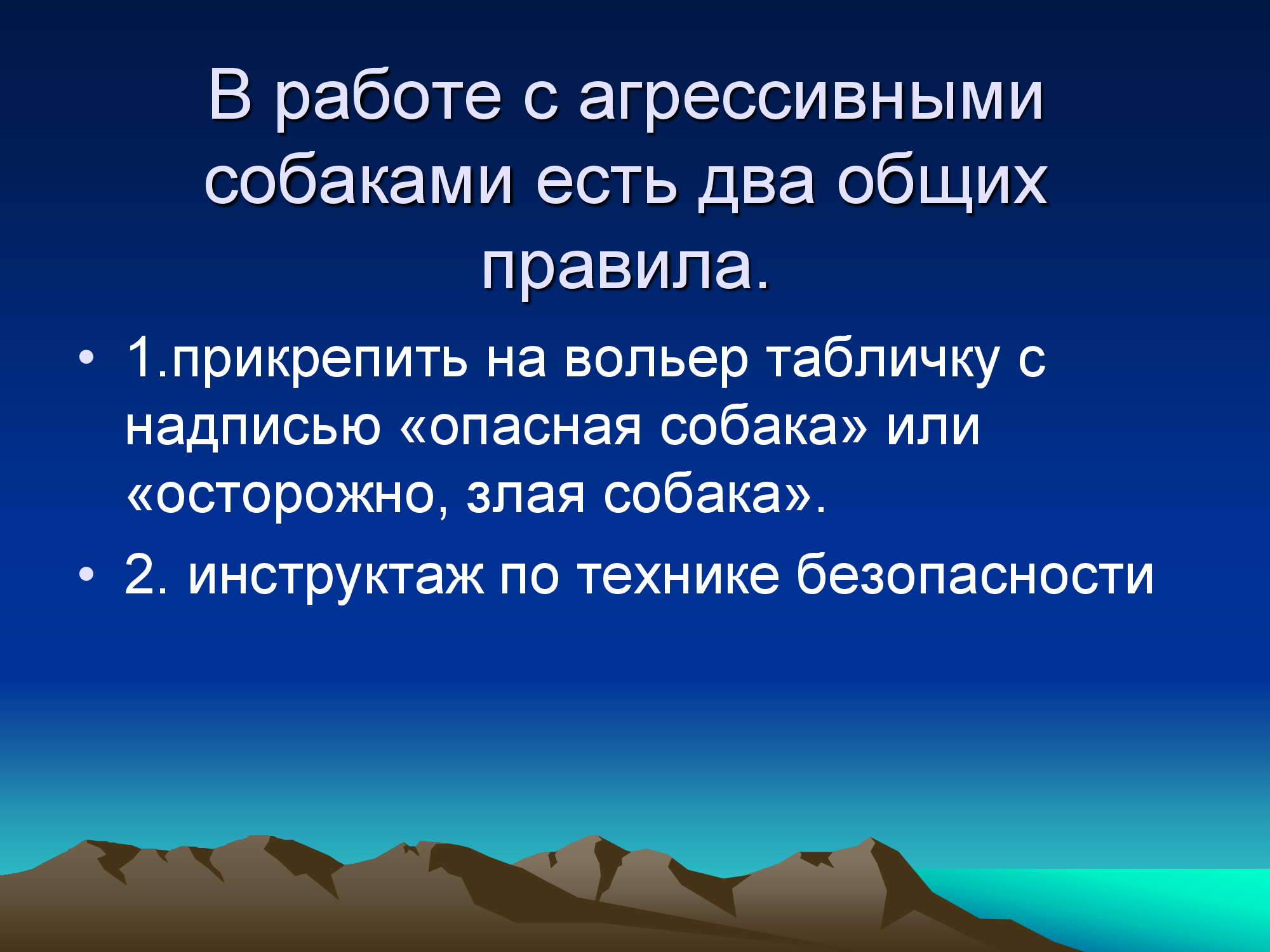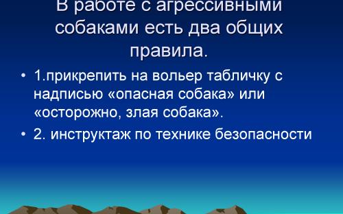 • Второе правило –инструктаж обслуживающего персонала по технике безопасности. Как себя вести, чтобы не провоцировать агрессию животного, чтобы не допустить покусов и травм для персонала, который контактирует с данной собакой.