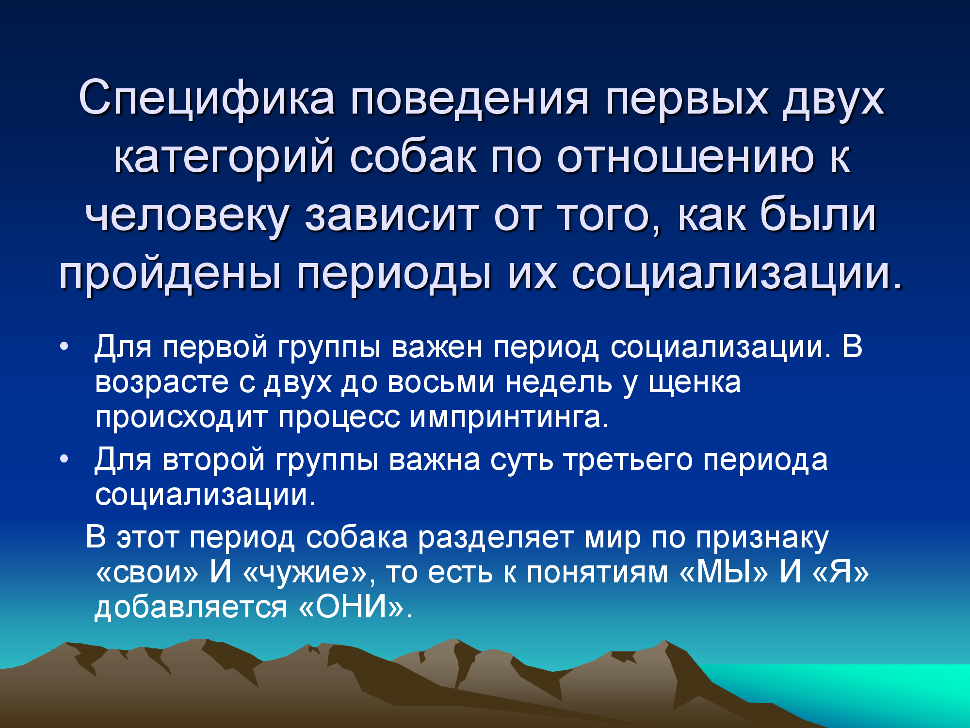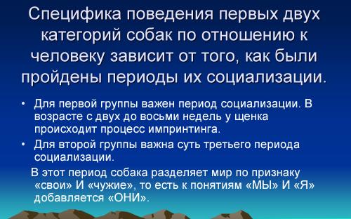 Специфика поведения первых двух категорий собак по отношению к человеку зависит от того, как были пройдены периоды их социализации.