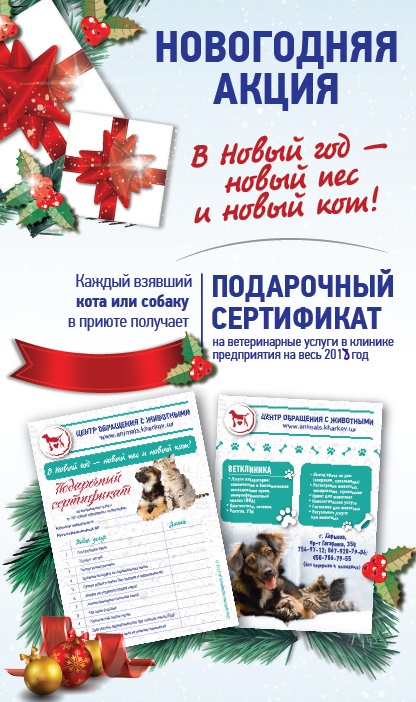 В рамках акции: каждый, взявший кота или собаку в Приюте получает на это животное подарочный сертификат на ветеринарные услуги в клинике предприятия на весь 2018 год.