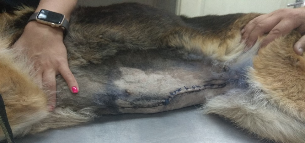 На приеме была собака немецкая овчарка, 12 лет, сука. С жалобами на вялость, апатию, снижению аппетита. Пальпаторно в брюшной полости отмечалось массивное образование, Температура тела 38,4 *С , слизистые розовые, лимфоузлы не увеличены. По результатам диагностики ( рентгенологического исследования, УЗД диагностики, анализов крови и др.) выявлено массивное новообразования диаметром 60 см. Животное было прооперировано, новообразование на левом яичнике, вес :6,900 кг. На данный момент животное выписано из стационара, состояние животного хорошее. На цитологии выявлены признаки атипии. Отправлен материал на гистологию. Рекомендована консультация онколога.