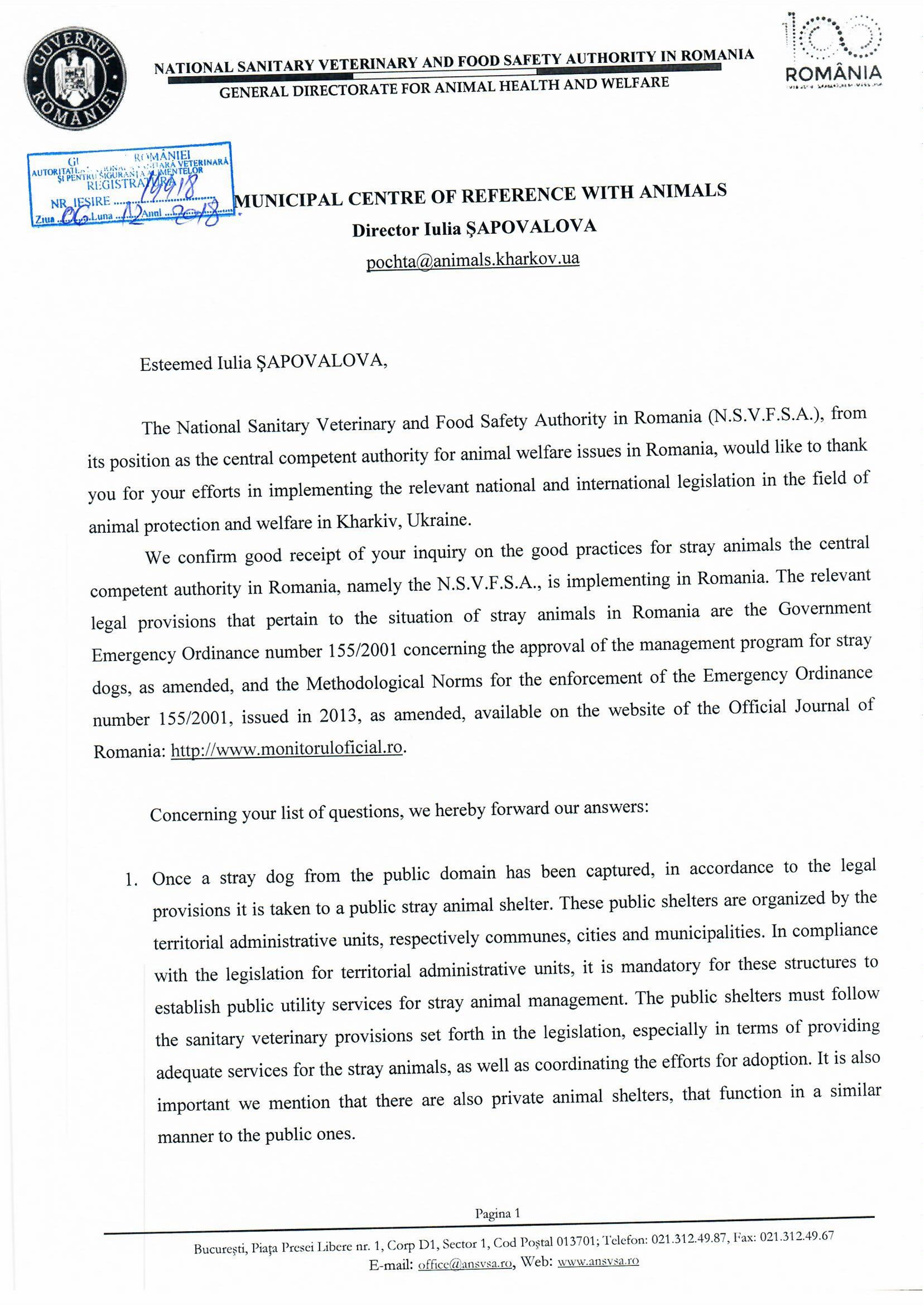 КП "Центр обращения с животными" на свой запрос получило ответ центрального компетентного органа по вопросам защиты животных в Румынии - Национального органа санитарной ветеринарии и безопасности пищевых продуктов в Румынии (N .SVFSA).
