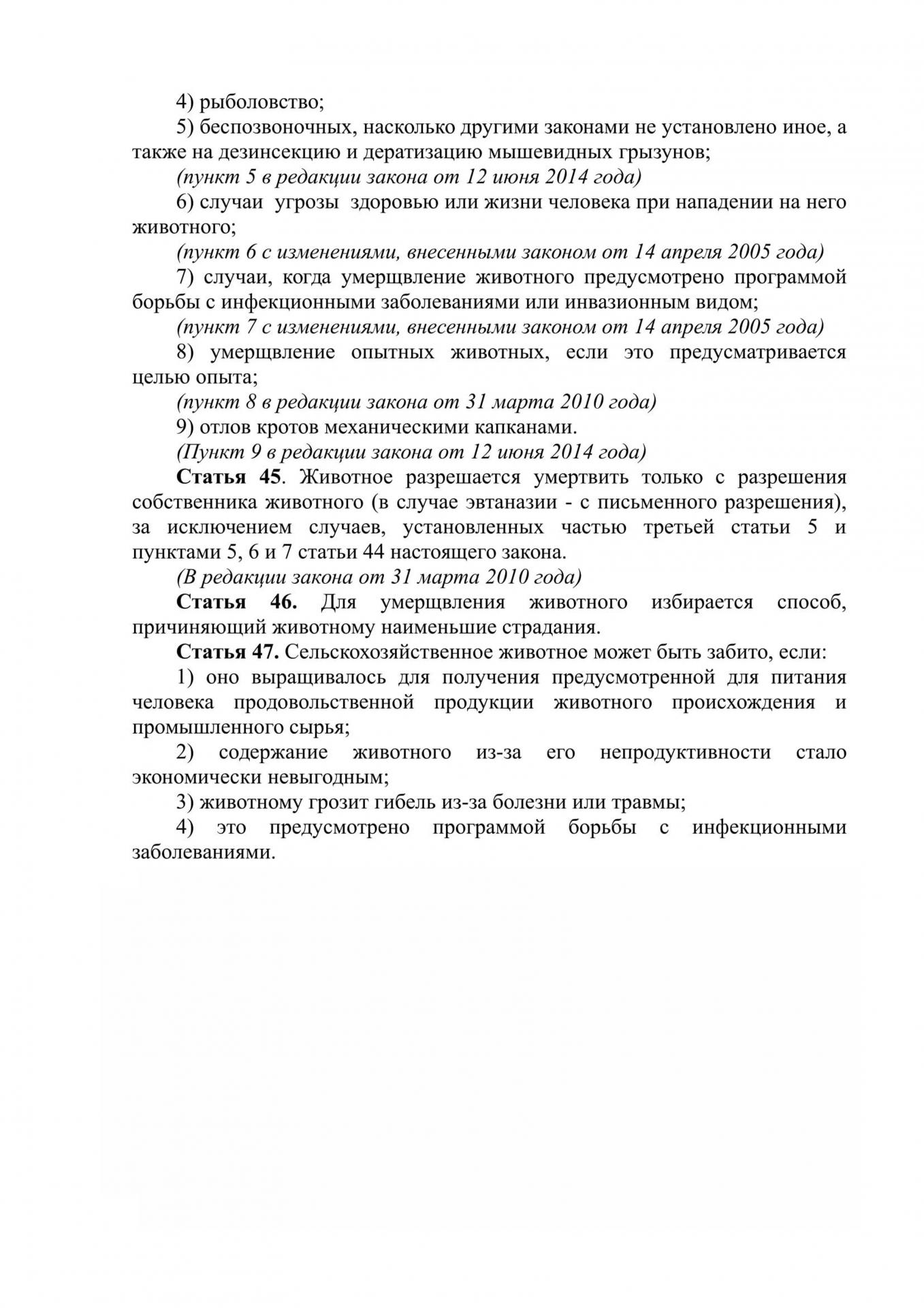 Согласно ст.1061 Кодекса Латвии об административных правонарушениях за нарушение требований в области уничтожения животных или за жестокое обращение с животными накладывается на физических лиц денежный штраф от 5 до 250 латов, на юридических лиц – от 10 до 500 латов, с конфискацией животных или без нее.