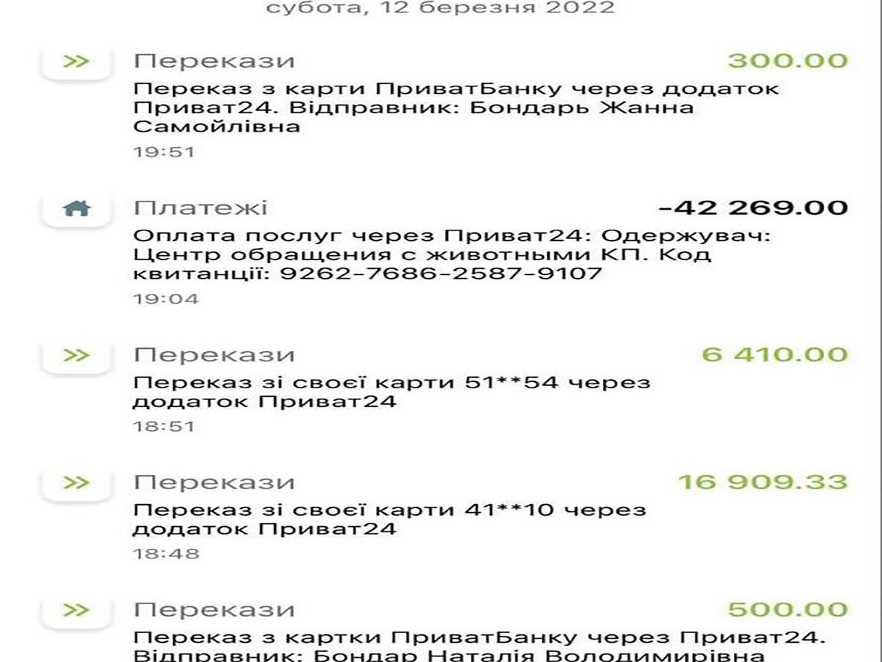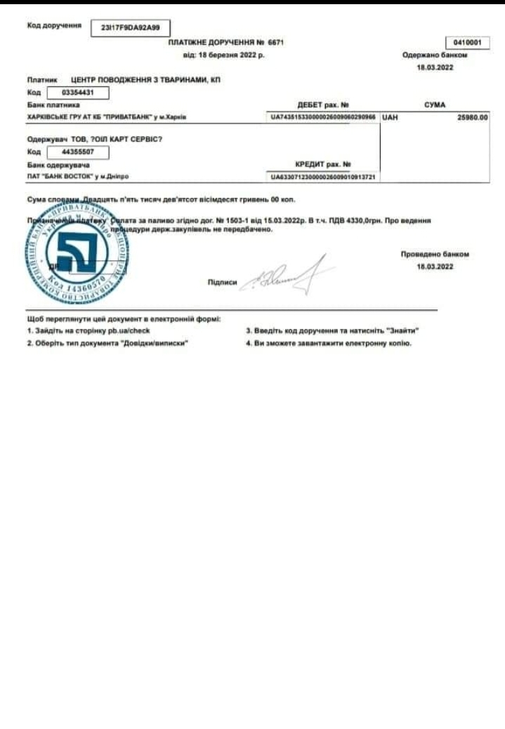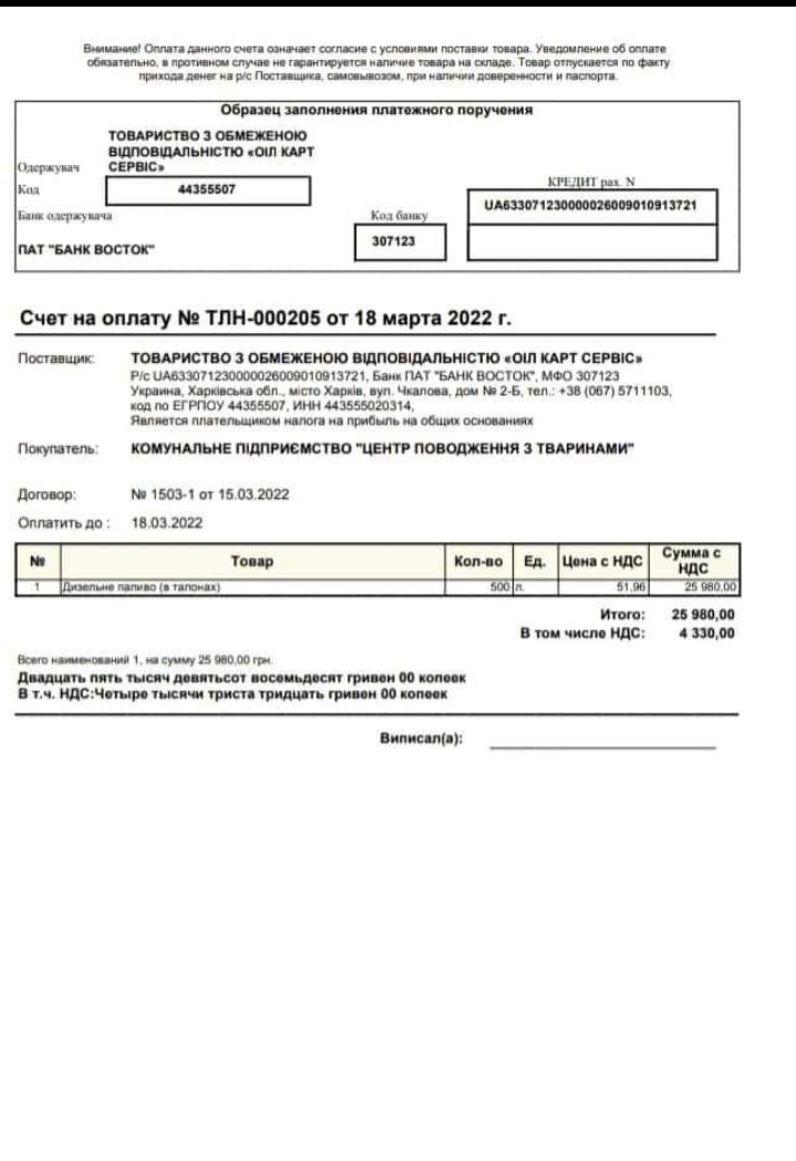 18.03 було сплачено за 500л ДТ, ТОВ «ОІЛ КАРТ СЕРВІС» (доставка корму зі Львова) 25 980грн.;