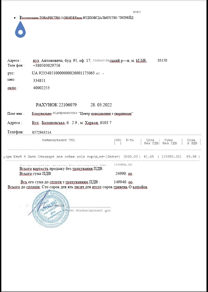 28.03 було сплачено за корм, ТОВ «Інтрейд мікс» м.Львів 149 940грн.