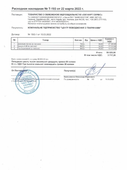 22.03 було сплачено за паливо, ТОВ «ОІЛ КАРТ СЕРВІС» 56 920грн.;