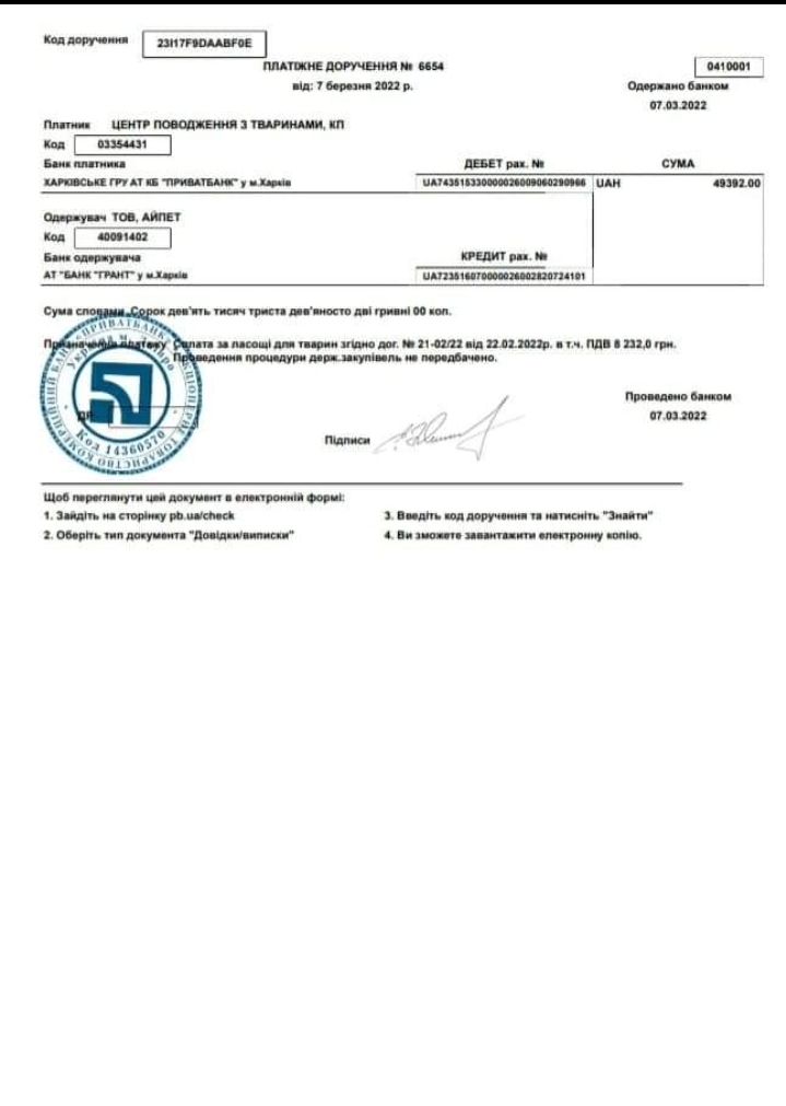 07.03 було сплачено за корм, компанія Сузір‘я м.Харків 49 392грн.;