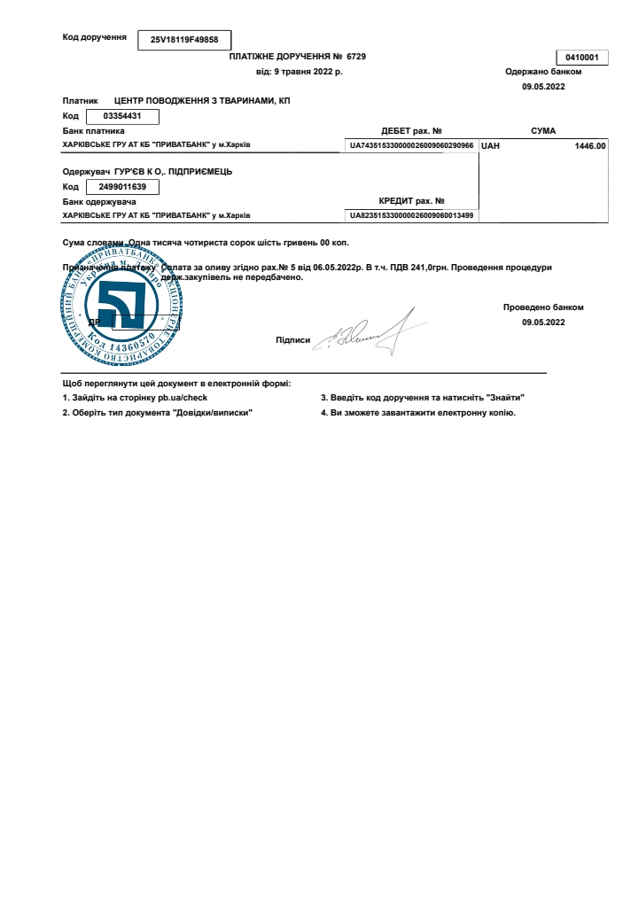 ● Сплачено за мастило для авто ФОП Гур`єв 1 446 грн