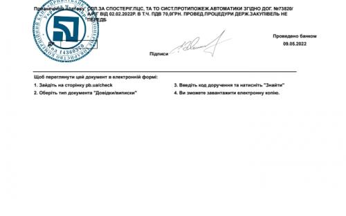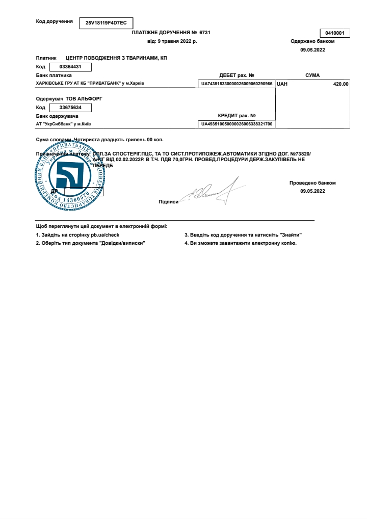 ● Сплачено ТО пожежної сигналізації ТОВ Альфорг 420 грн