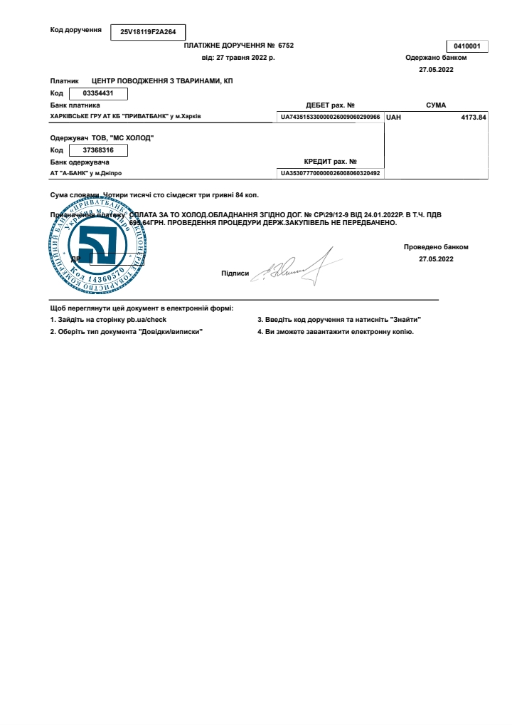 ● Сплачено за ремонт обладнання МС "Холод" 4 173,84 грн
