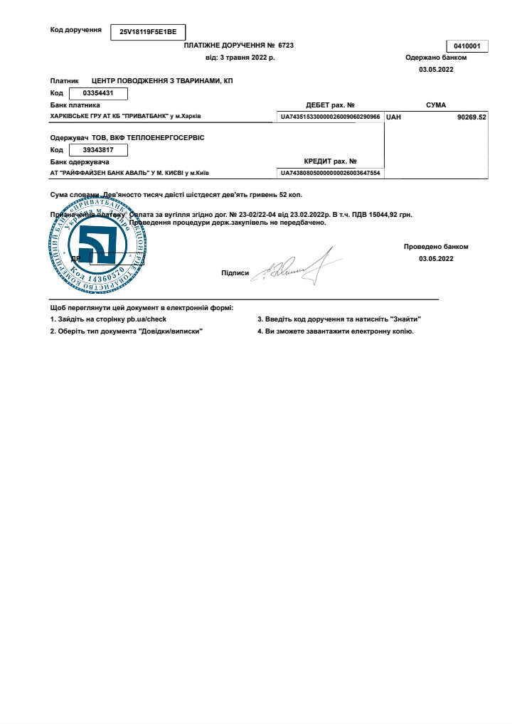 ● Сплачено за вугілля для опалювального сезону ТОВ Теплоенергосервис 90 269 грн