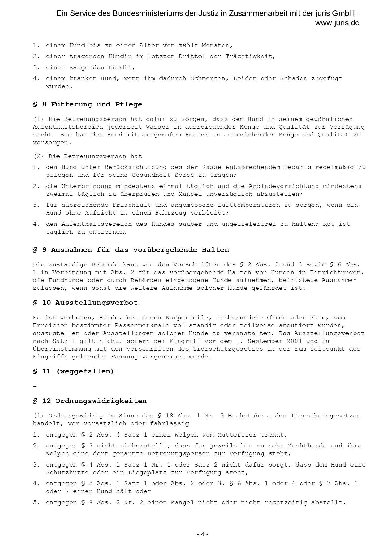 TierSchHuV Дата составления: 02.05.2001 Полное название: "Положение о защите и содержании собак от 2 мая 2001 г. (Федеральный кодекс законов (BGBl.) I стр. 838), измененное статьей 3 закона от 19 апреля 2006 г. (BGBl. I, стр. 900)". Состояние: изменено статьей 3 Закона от 19.4.2006 I 900 Сноска Дата составления текста: 1.9.2001 Введение: Федеральное министерство по защите прав потребителей, продуктам питания и сельского хозяйства постановляет после заслушивания комиссии по защите животных, основываясь на статье 56 Закона об упорядочении компетентности органов от 18 марта 1975 г. (BGBl. I, стр. 705) и Приказе от 22 января 2001 г. (BGBl. I, стр. 127), § 2a п. 1, § 11b п. 5, а также § 12 п. 2 абз. 1 № 4, § 16b п. 1 абз. 2 Закона о защите животных в редакции от 25 мая 1998 г. (BGBl. I, стр. 1105, 1818), из которых § 2a п. 1 № 5, § 11b п. 5 и § 12 п. 2 абз. 1 № 4 изменены статьей 2 Закона от 12 апреля 2001 г. (BGBl. I, стр. 530), следующее:
