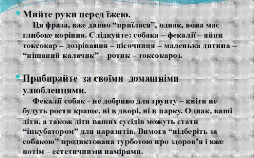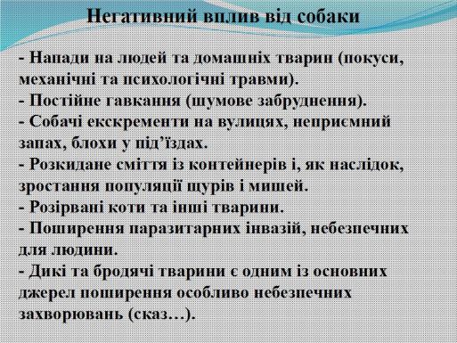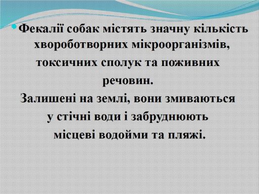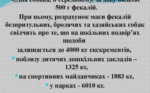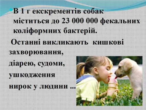 Як показали результати досліджень, зелена зона біля шкіл, дитячий майданчик та майданчик для вигулу собак облаштовані відповідно до санітарно-гігієнічних вимог. Масовий вигул собак має місце поруч зі школами: в парку біля Київського національного університету ім. Тараса Шевченка та в ботанічному саду ім. Фоміна. При обстеженні окремих ділянок нами знайдено яйця гельмінтів. Так, на ділянці №1, яка є зеленою зоною біля середньої школи № 33, у пробах ґрунту виявлено 3 яйця від собак збудника Toxocara canis та 2 від людей – Ascaris lumbricoides. У пробах фекалій собак виявлено 68 яєць збудника Toxocara canis та 16 члеників і 6 яєць Echinococcus granulosus. На ділянці №2, яка є дитячим майданчиком біля цієї школи, у пробах піску знайдено 2 яйця Echinococcus granulosus. На ділянці №3, яка є спеціально обладнаним майданчиком для вигулу собак у пробах фекалій виявлено 6 яєць Toxcara canis, 7 – Toxascaris leonine, 9 – Trichuris vulpis, а також 5 члеників і 3 кокони Dipylidium caninum. На ділянці №4 – це дитячий майданчик біля середньої школи №87, у пробах піску знайдено 2 яйця Echinococcus granulosus. На ділянці №5, яка є зеленою зоною біля середньої школи № 87, у пробах ґрунту виявлено 1 яйце Ascaris lumbricoides, а у пробах фекалій собак 8 яєць Toxоcara canis, 2 членики Dipylidium caninum і 3 Echinococcus granulosus.