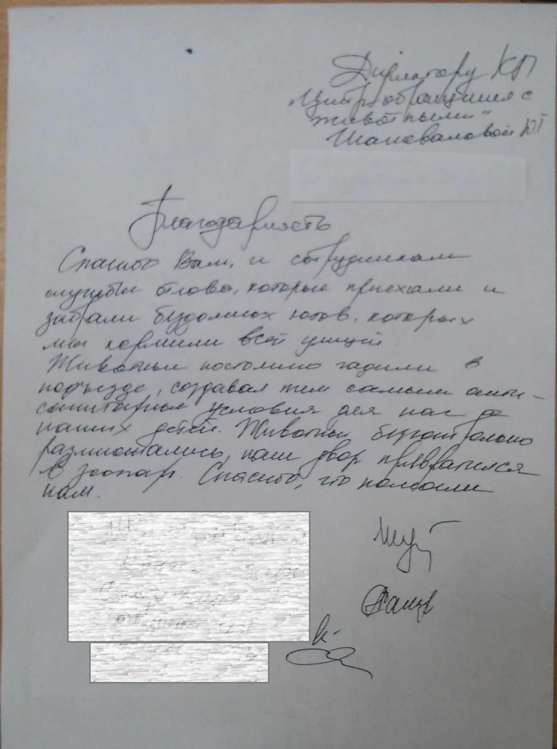 Жильцы двора в котором вылавливали котов, написали нам коллективную благодарность, за проделанную работу.