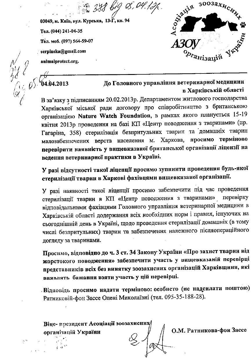 11 марта 2013 года на митинге, который прошел под стенами харьковской мэрии, зоозащитными организациями харьковщины был выдвинут ряд требований к Харьковскому городскому совету. Один из пунктов требований гласил: "Требуем обеспечить бесплатную и качественную стерилизацию для малообеспеченных и незащищенных слоев населения с предварительным согласованием желающих с зоозащитными организациями Харьковщины".
