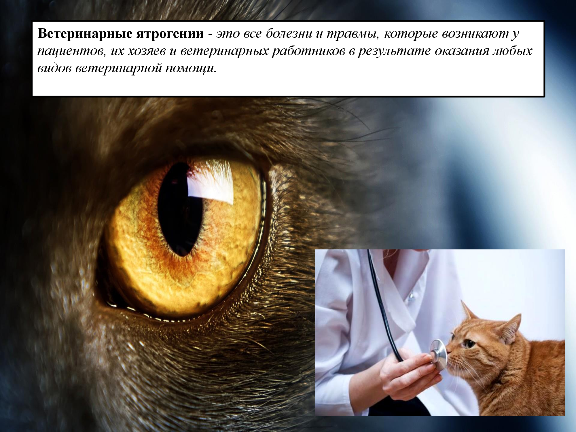 Сегодня существует масса различных определений ветеринарной ятрогении, но наиболее полно все многообразие отражает следующее: ветеринарные ятрогении - это все болезни и травмы, которые возникают у пациентов, их хозяев и ветеринарных работников в результате оказания любых видов ветеринарной помощи.
