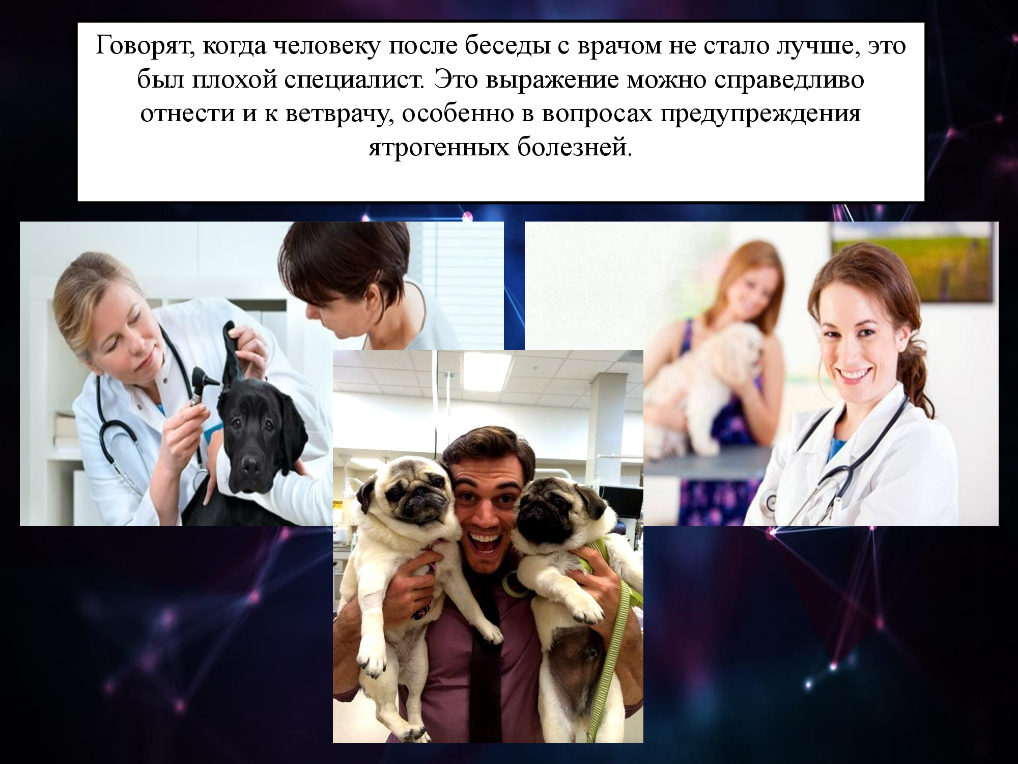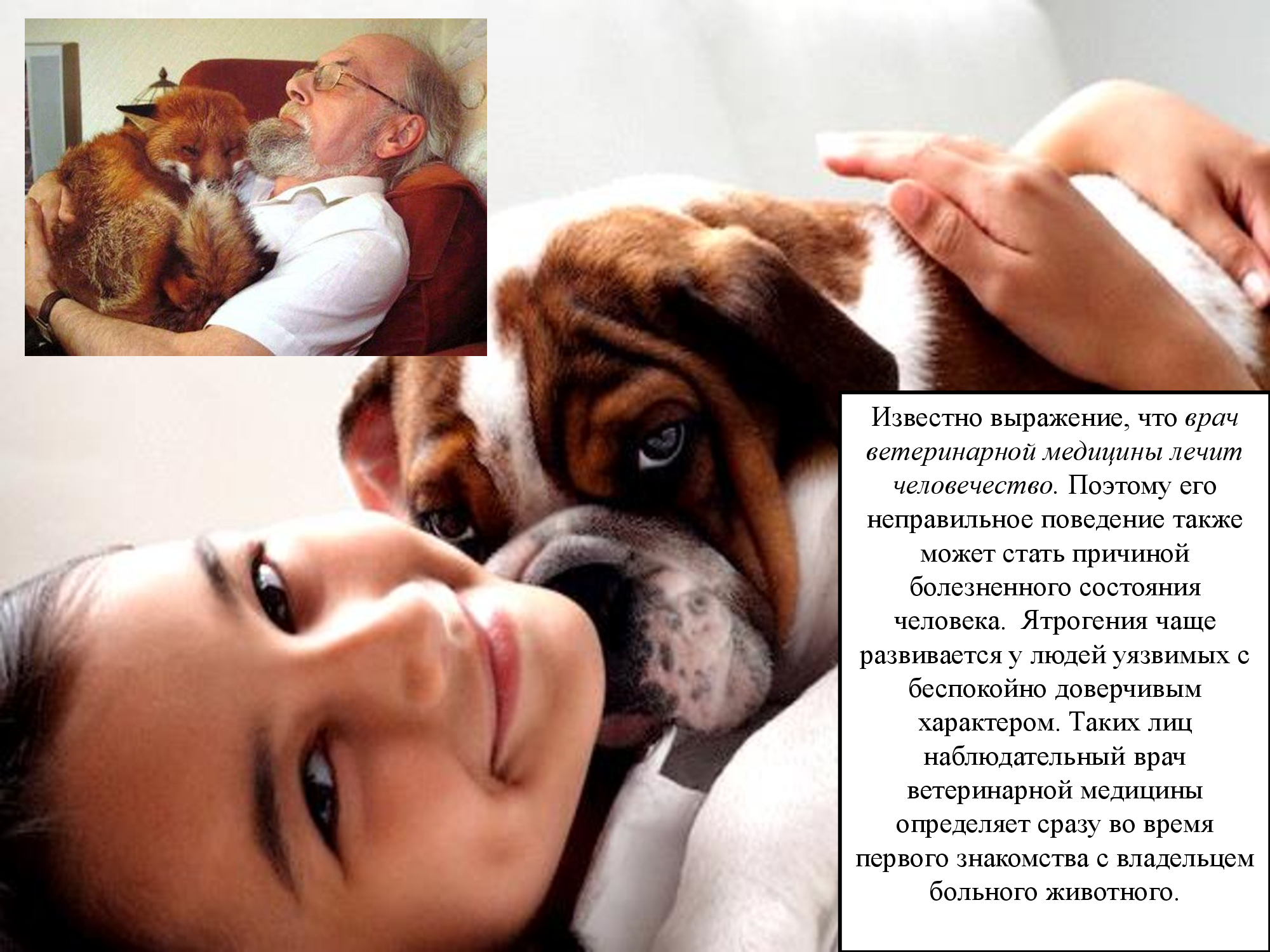 Известно выражение, что врач ветеринарной медицины лечит человечество. Поэтому его неправильное поведение также может стать причиной болезненного состояния человека. Ятрогения чаще развивается у людей уязвимых, с беспокойным и доверчивым характером. Таких лиц наблюдательный врач ветеринарной медицины определяет сразу во время первого знакомства с владельцем больного животного.