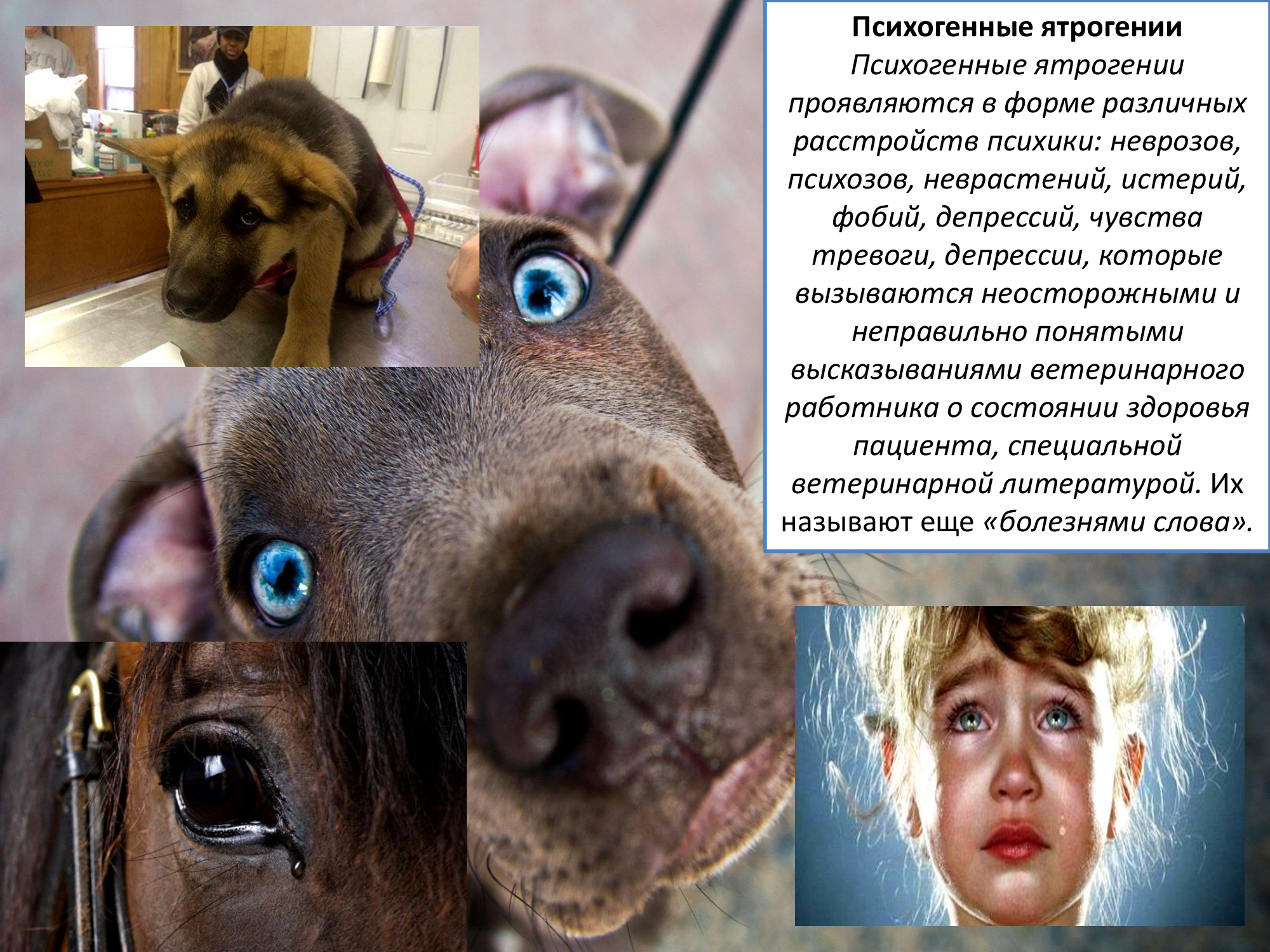 Психогенные ятрогении проявляются в форме различных расстройств психики: неврозов, психозов, неврастений, истерий, фобий, депрессий, чувства тревоги, депрессии, которые вызываются неосторожными и неправильно понятыми высказываниями ветеринарного работника о состоянии здоровья пациента, специальной медицинской литературой. Их называют еще «болезнями слова».