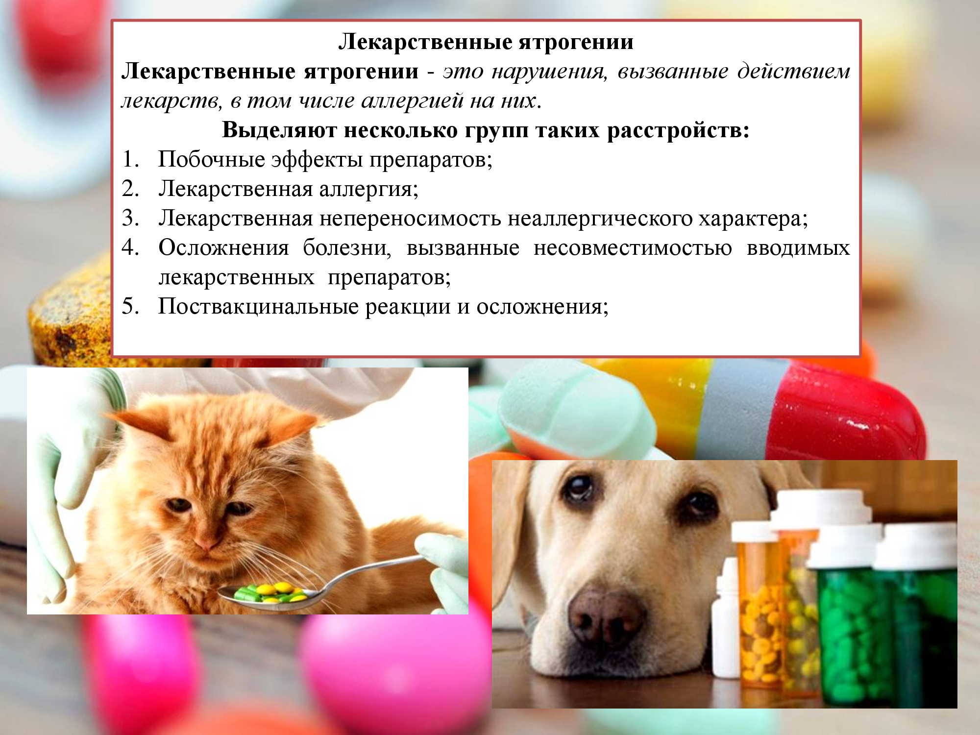 Побочное действие препаратов даже при правильном их использовании приводит иногда к развитию патологии у некоторых животных и стрессовой реакции у врача. Проблема фармацевтической ятрогении включает и современную тенденцию к полипрагмазии (одновременное использование многих лекарственных препаратов, что обусловлено требованиями сегодняшнего дня. Вследствие влияния на организм животного не одного, а нескольких негативных факторов, патология развивается сложнее, и для её ликвидации нужно разностороннее действие препаратов. В практике ветеринарной медицины известна и так называемая избыточная фармакотерапия, особенно при срочной, неотложной помощи животному, у которого диагноз пока что точно не установлен.