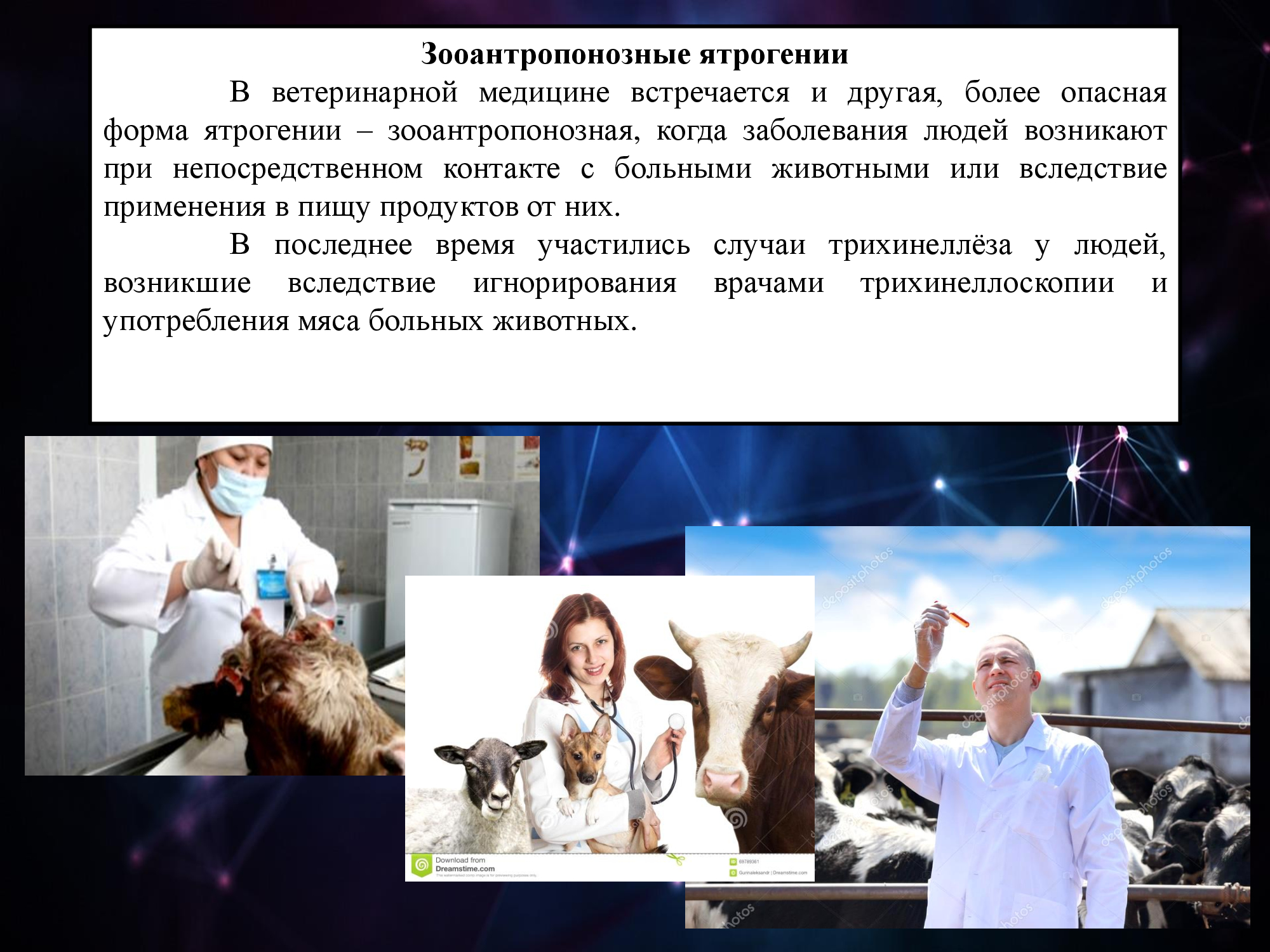 В ветеринарной медицине встречается и другая, более опасная форма ятрогении – зооантропонозная, когда заболевания людей возникают при непосредственном контакте с больными животными или вследствие применения в пищу продуктов от них.