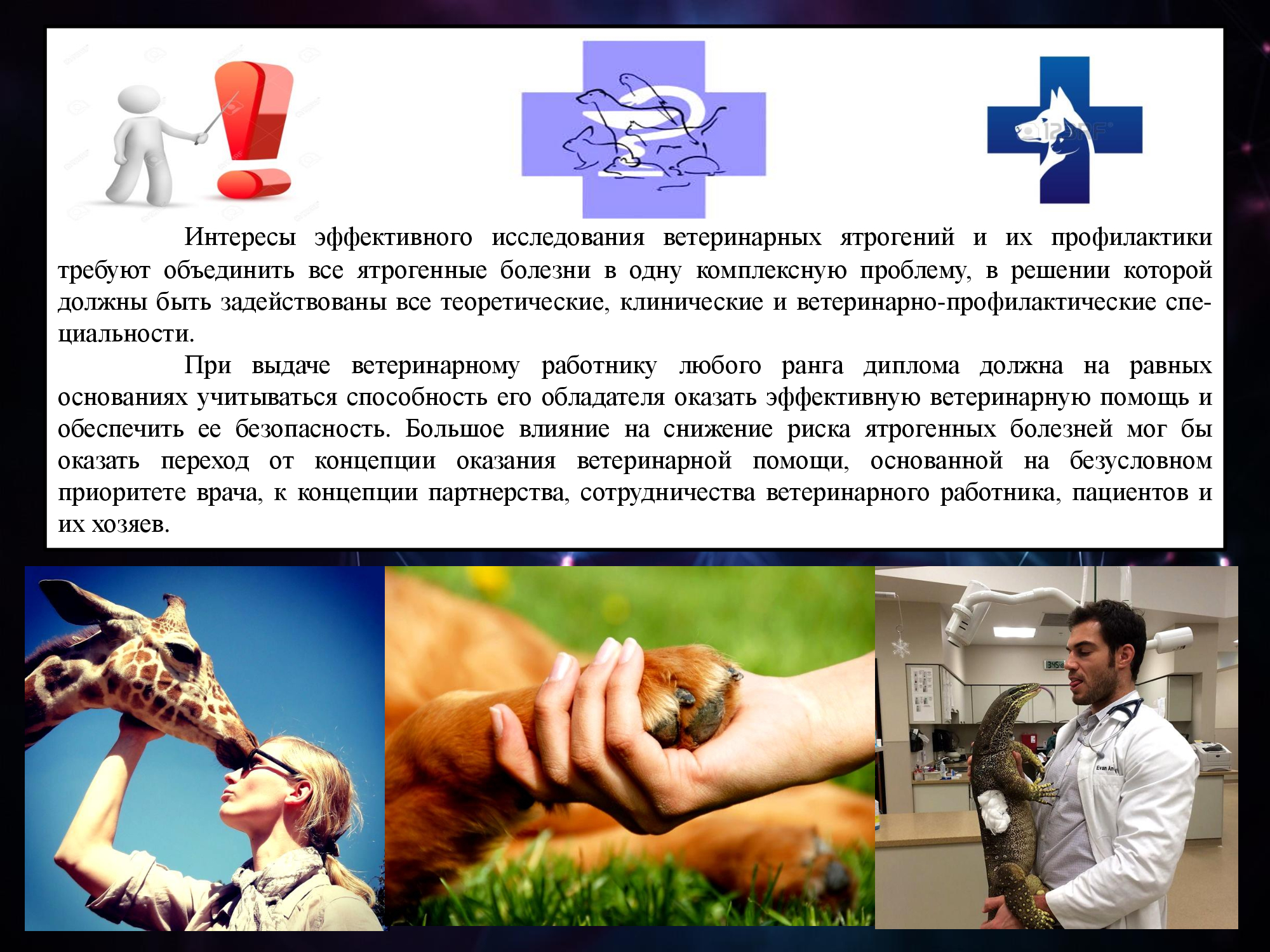 Приходится констатировать, что истинные масштабы потерь здоровья и материальных ресурсов от ятрогенных заболеваний еще не осознаны. Только этим можно объяснить доходящую до полной бездеятельности пассивность ветеринарной науки в исследовании этой порожденной ветеринарной группы болезней животных. Осознание этого факта должно побудить внести новые элементы в стратегию и тактику оказания ветеринарной помощи животным. В соответствии с этим научная разработка и практическая реализация безопасных условий оказания ветеринарной помощи должны стать приоритетной задачей науки и техники, ветеринарии в целом.