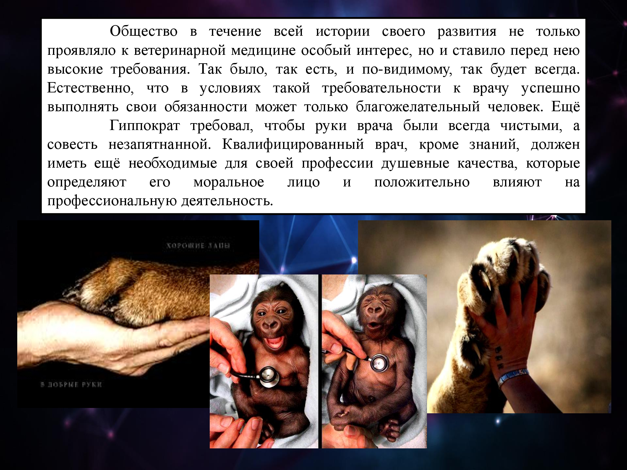 Общество в течение всей истории своего развития не только проявляло к ветеринарной медицине особый интерес, но и ставило перед нею высокие требования. Так было, так есть, и по-видимому, так будет всегда. Естественно, что в условиях такой требовательности к врачу успешно выполнять свои обязанности может только благожелательный человек. Ещё Гиппократ требовал, чтобы руки врача были всегда чистыми, а совесть незапятнанной. Квалифицированный врач, кроме знаний, должен иметь ещё необходимые для своей профессии душевные качества, которые определяют его моральное лицо и положительно влияют на профессиональную деятельность.