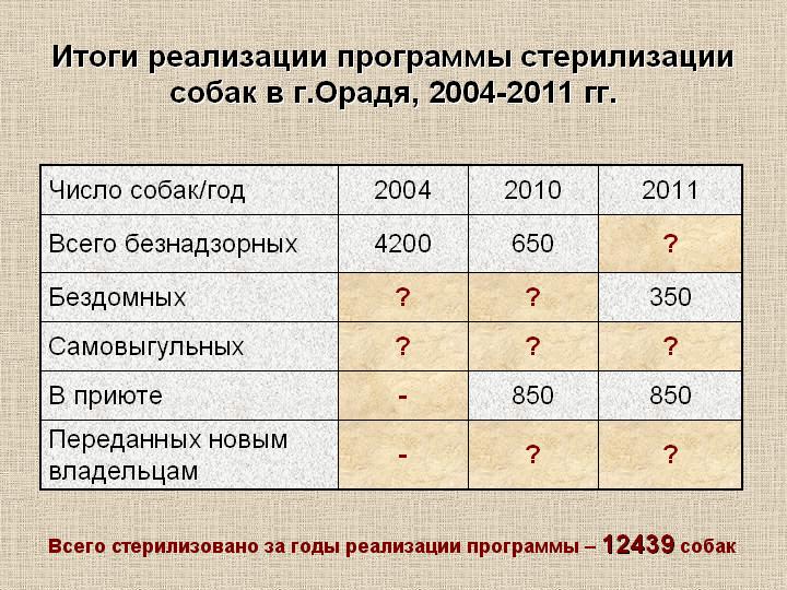 Программа ОСВ в г.Орадя (Румыния) позиционируется как одна из самых удачных: декларируется снижение численности бездомных собак от 4200 до 350 особей на протяжении 2004-2011 годов. Однако, при изучении сведений, предоставленных спонсором и исполнителем программы [7; личное сообщение], оказывается, что исходное число животных существенно завышено: в него вошли также имеющие владельцев собаки, выпущенные на самовыгул. Кроме того, в 2011 году, кроме 350 уличных собак; имеется еще 500 содержащихся в частном приюте, и 350 – в муниципальном приюте Оради. Таким образом, исходное количество бесхозяйных собак в городе неизвестно, но оно заведомо ниже заявленных 4200; а количество живых бесхозяйных собак на 2011 год составляло не 350 – а 1200 особей. Кроме того, более тысячи животных были изъяты с улиц, и переданы новым владельцам – в том числе, за пределы Румынии. Таким образом, регулирование численности популяции происходило, в значительной мере, за счет массового безвозвратного изъятия.