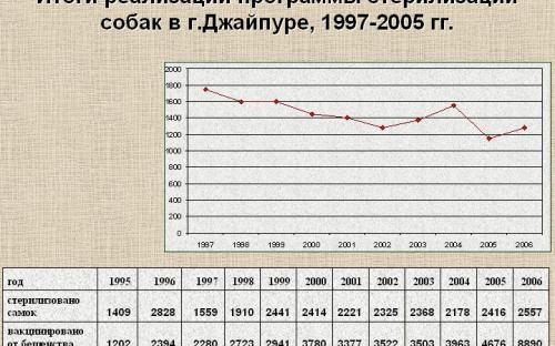 Согласно данным учета бездомных собак в исторической части г.Джайпура (Индия), достижение 65-70% охвата кастрацией самок привело к снижению общей численности собак на 28% в течение двух лет [5]. Однако результаты последующих наблюдений [6] свидетельствуют о прекращении снижения численности животных, и стабилизации ее на уровне около 70% от исходной, с незначительными флюктуациями из года в год.
