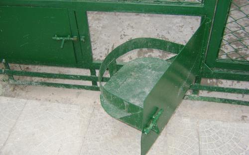 Для изготовления передней стенки вольера можно использовать металлический прут (арматуру) не менее 1см в диаметре, наваренную на металлический каркас вертикально на расстоянии 5см и перехваченную горизонтально прутом в 2-3 местах. Также подойдет плетеная металлическая решетка с d проволоки не менее 4 мм.