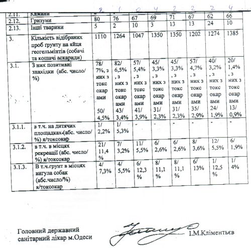 Также актуальна проблема загрязненности почвы в курортном городе Одессе яйцеглистами, так как дегельментизацию собакам необходимо проводить каждые 3 месяца. Значительно загрязнены пляжи, парки, морские склоны — там особенно велика численность бродячих собак.