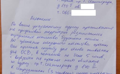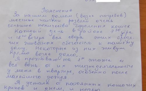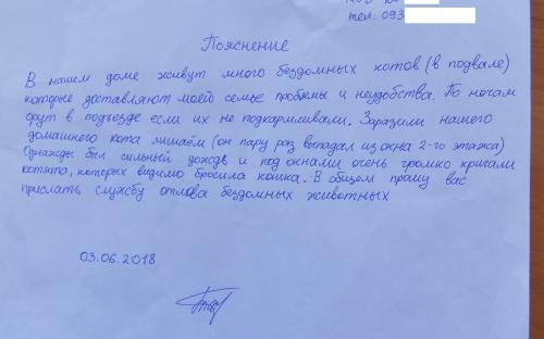 История про бездомных котят, которые обитают по адресу проспект Героев Сталинграда 140 Б, началась 3 июня. Именно в этот день в «ЦОЖ» поступила первая заявка – жалоба, в которой говориться: «в нашем доме живет много бездомных котов, которые доставляют моей семье проблемы. Прошу вас службу отлова бездомных животных». Далее и подпись и дата. На следующий день новая заявка – жалоба: «Я проживаю на первом этаже, и вся вонь от их жизнедеятельности котов у меня в квартире, особенно после дождя. Претензий к сотрудникам отлова не имею». Далее еще три заявления от жильцов этого же дома, итого 5 заявлений. Каждая подкреплена подписью.