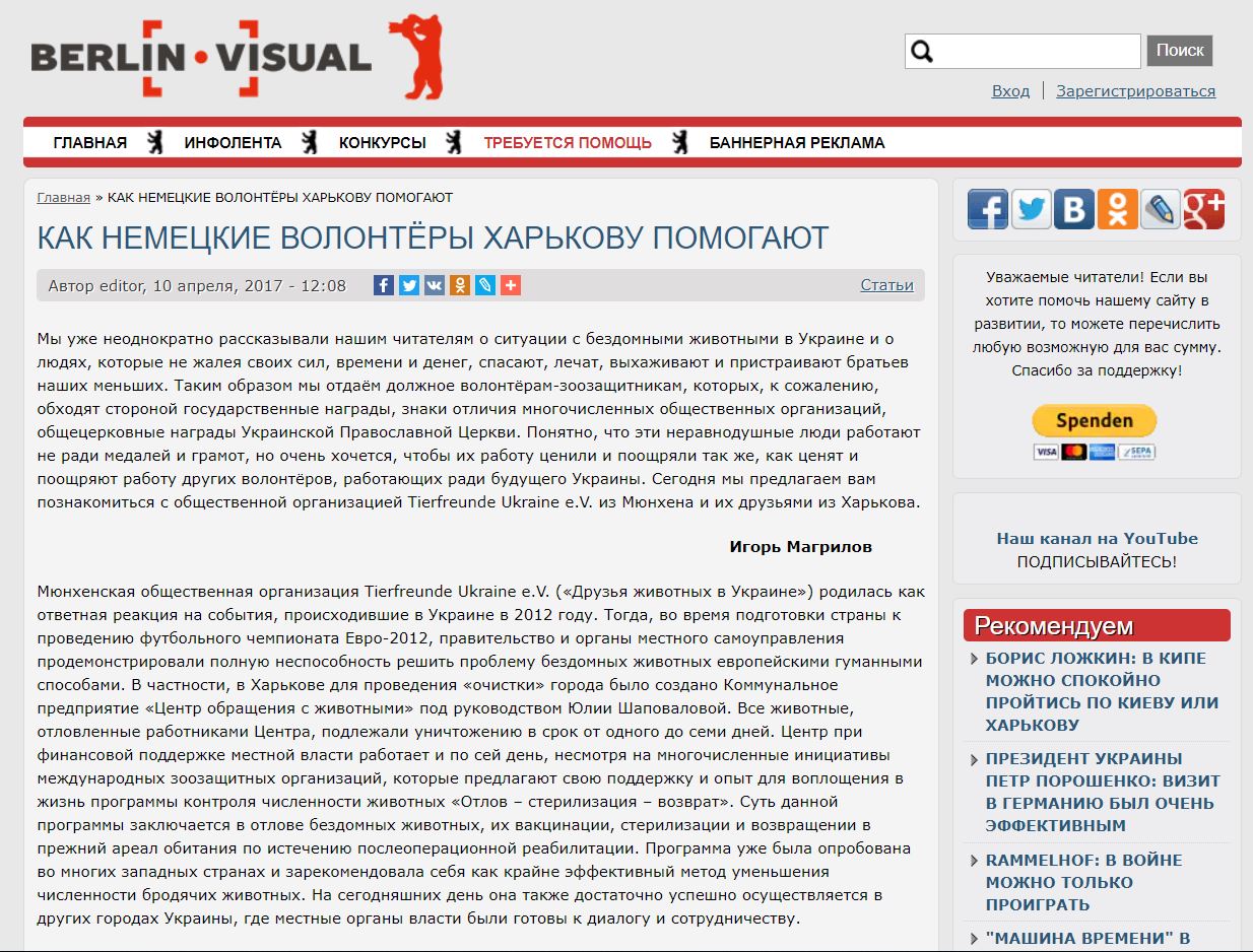 Приютов, на которые немецкая организация активно собирает пожертвования в действительности не существует. Фотографии искалеченных животных взяты из интернета, а истории про нуждающихся в помощи животных – вымышлены. Если хотя-бы одна из описанных историй произошла на самом деле, она тотчас была бы бурно обсуждаема в харьковских группах помощи животным социальной сети Facebook.