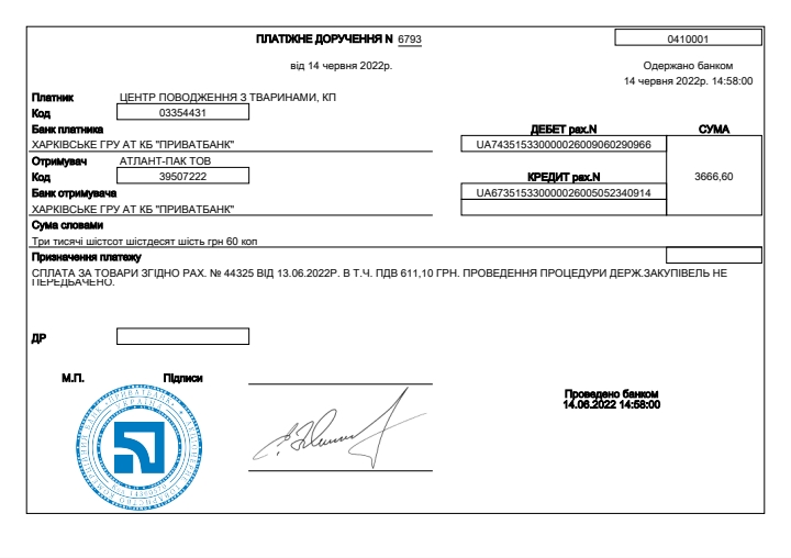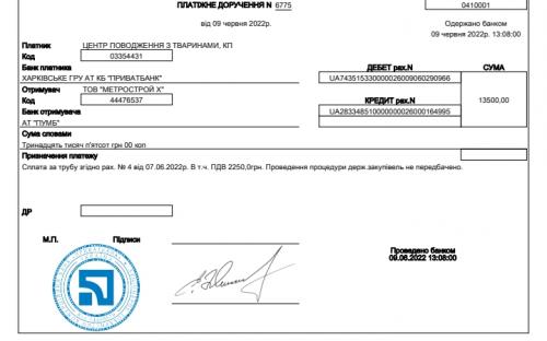 Звіт надходдення благодійних коштів та витрат підприємства за червень 2022року.