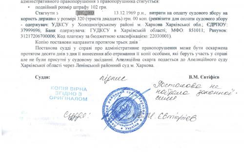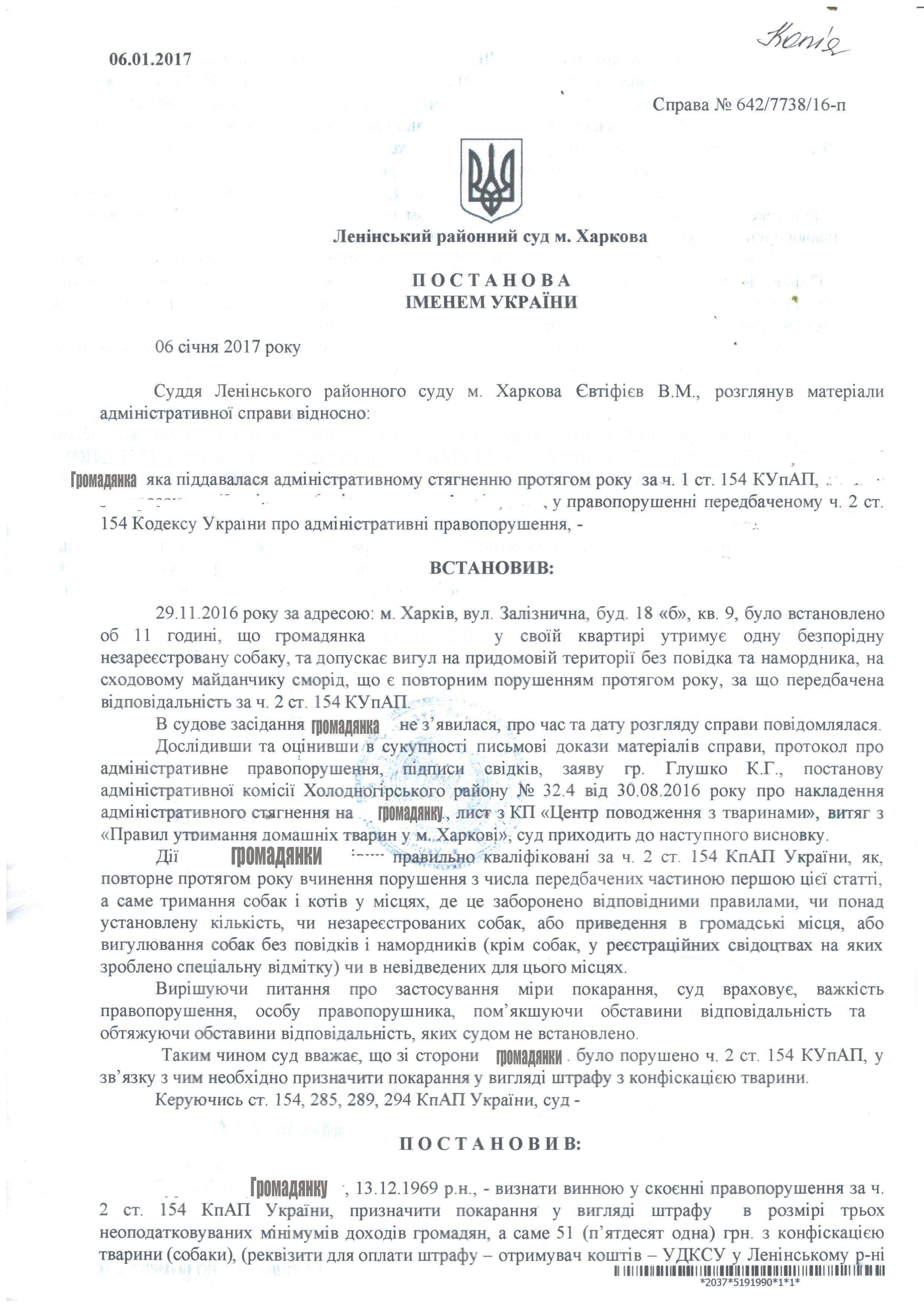 Ленинский районный суд рассмотрел дело о административном правонарушении по ст.154 часть 2. И вынес решение о наложение штрафа и конфискации собаки. Этому предшествовали многочисленные жалобы от соседей на нарушение "Правил содержание домашних животных в городе Харькове"
