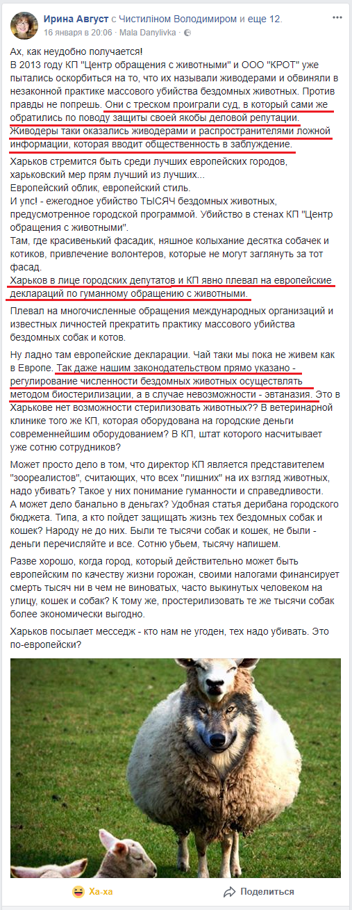 В приведенном сообщении Ирины Август от 16.01.2018 г. три раза высказана недостоверная информация.