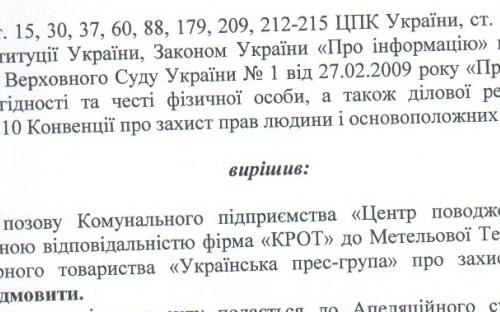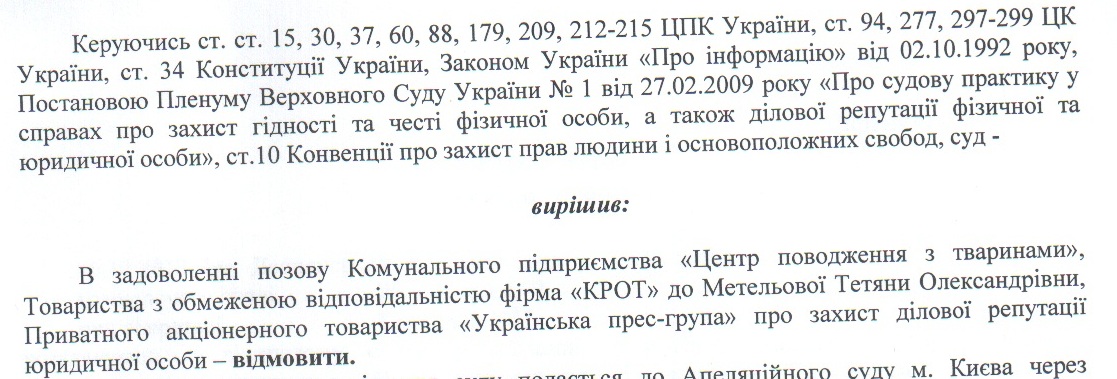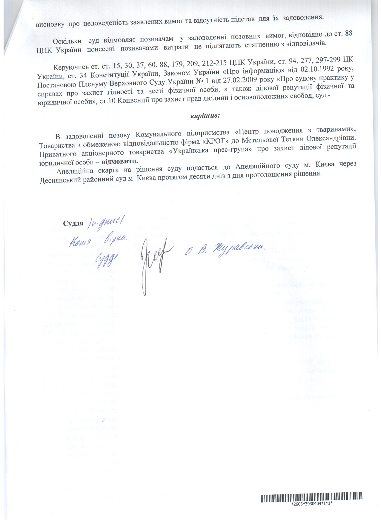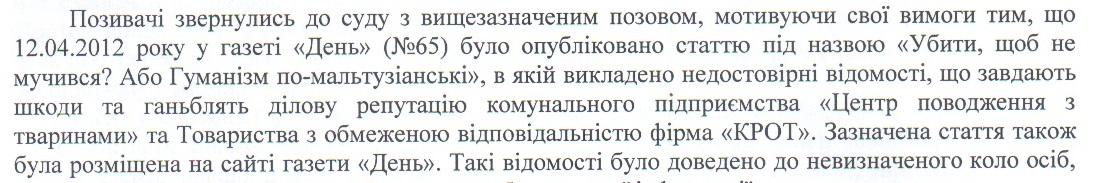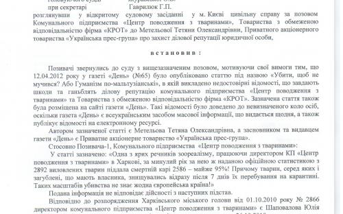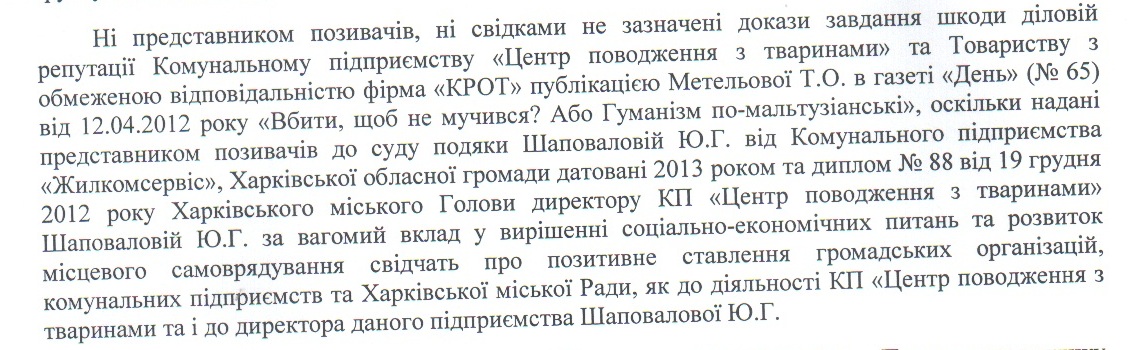 КП ЦОЖ в 2013 г. подавало иск в суд о защите чести и деловой репутации предприятия на некорректные и неправдивые высказывания о работе предприятия журналисткой Татьяной Метелевой. Но суд отказал в удовлетворении исковых требований, поскольку предоставленные суду грамоты и благодарности адресованные коммунальному предприятию "Центр обращения с животными" были расценены судом как позитивное отношение общественных организаций и харьковских органов местного самоуправления к работе предприятия. Такое решение не корректно называть проигранным судом.