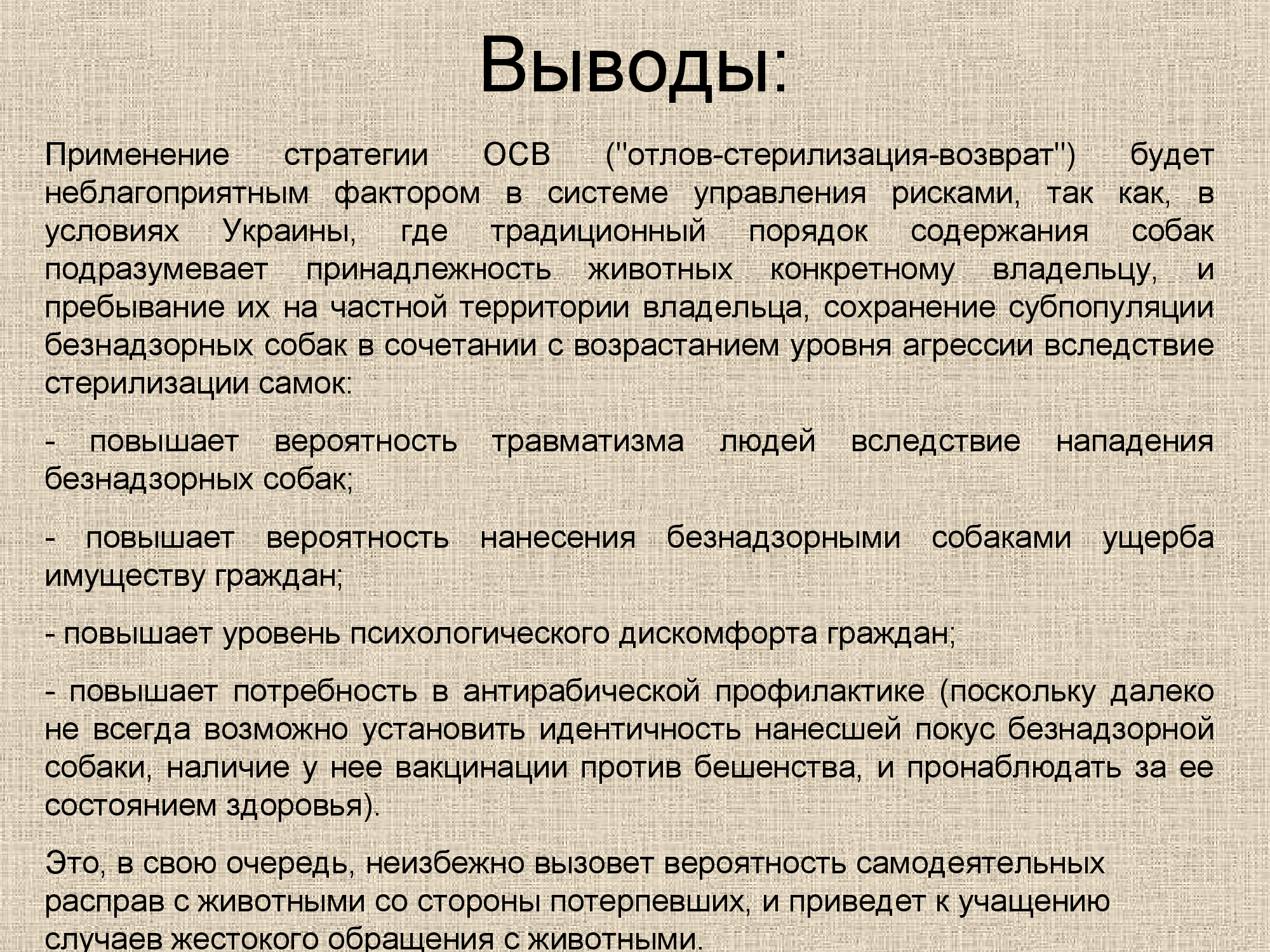 Применение стратегии ОСВ ("отлов-стерилизация-возврат") будет неблагоприятным фактором в системе управления рисками, так как, в условиях Украины, где традиционный порядок содержания собак подразумевает принадлежность животных конкретному владельцу, и пребывание их на частной территории владельца, сохранение субпопуляции безнадзорных собак в сочетании с возрастанием уровня агрессии вследствие стерилизации самок: