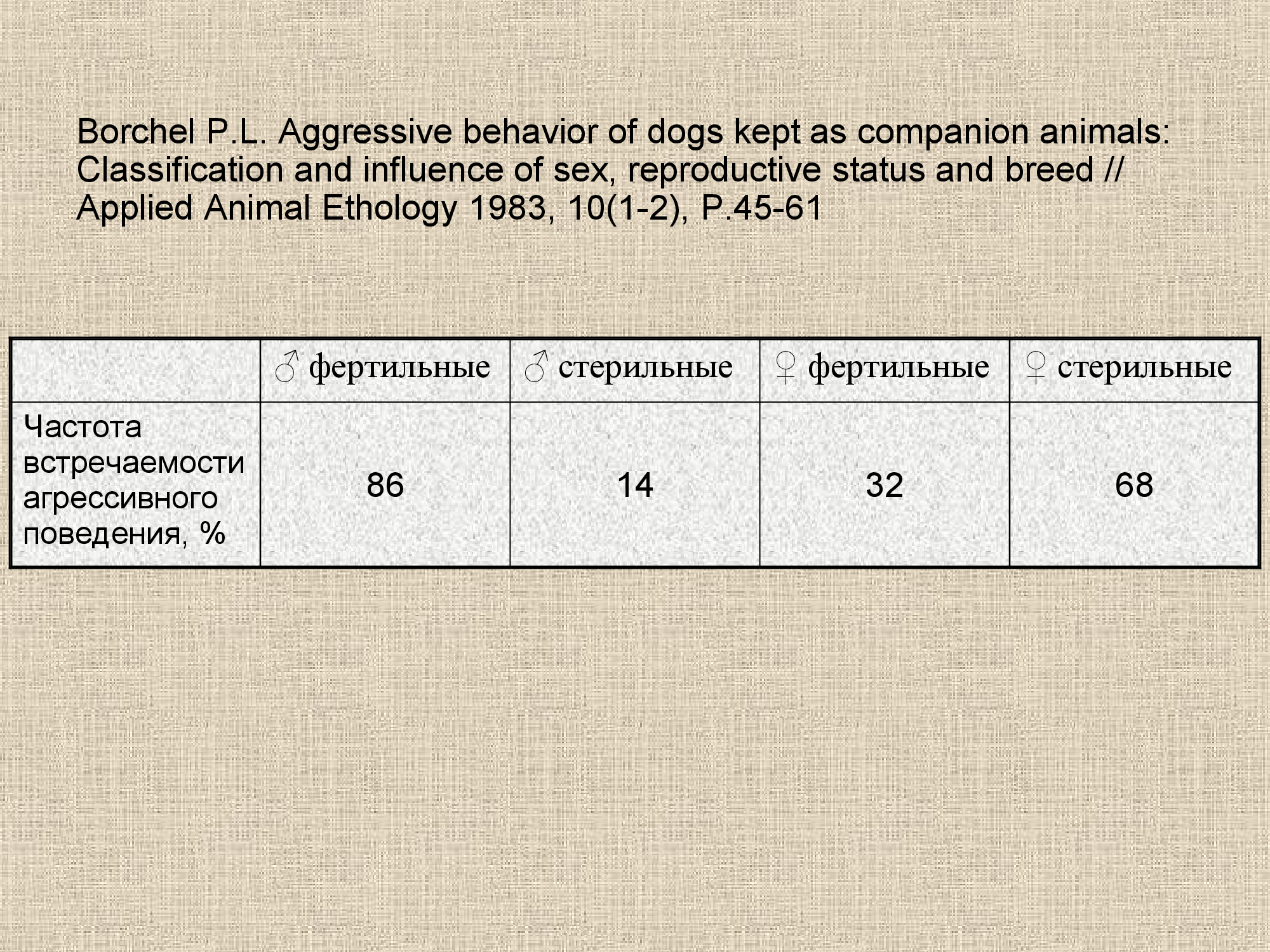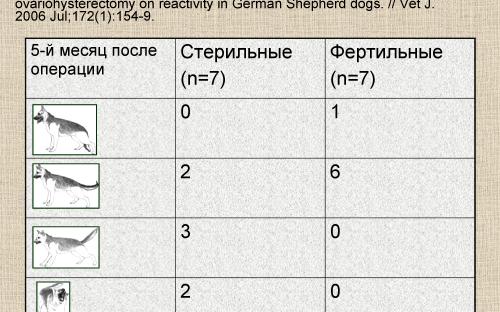 Действительно, в работе (Borchel, 83) было описано следующее явление: в группе кастрированных самцов частота проявлений агрессивного поведения была ниже, чем среди некастрированных особей – но при этом среди самок, наоборот, по уровню агрессии лидировали кастрированные суки.