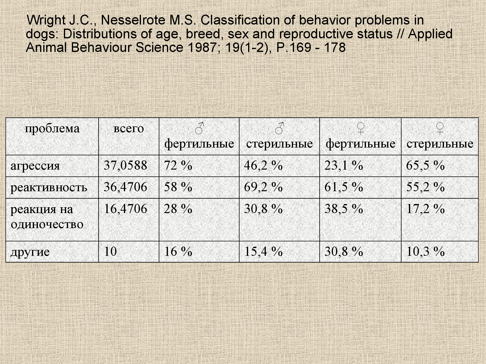 - Wright J.C., Nesselrote M.S. Classification of behavior problems in dogs: Distributions of age, breed, sex and reproductive status // Applied Animal Behaviour Science 1987; 19(1-2), Р.169 - 178