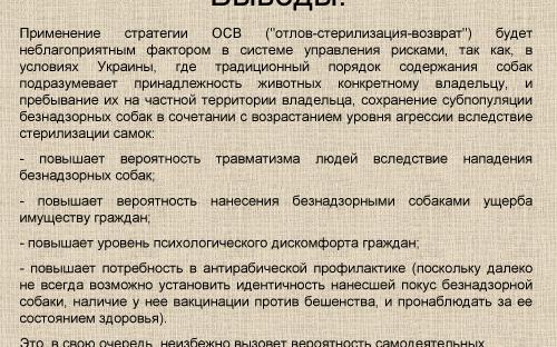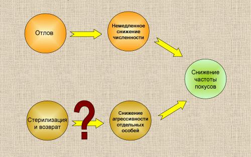 Таким образом, стерилизация самок безнадзорных собак с возвращением их в места обитания является фактором, повышающим риск конфликтов "человек-собака", и, следовательно, вероятность нанесения покусов.