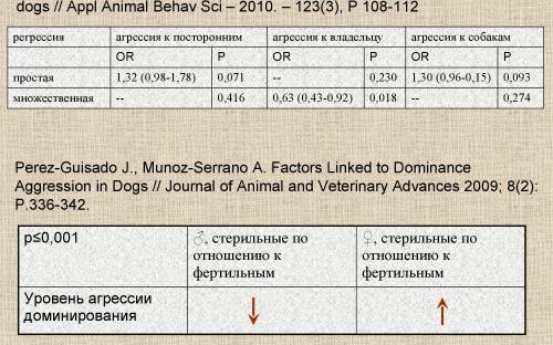 Третья попытка мультифакториального регрессионного анализа факторов, влияющих на агрессивность собак (Perez-Guisado, 09) опять показала наличие статистически достоверной зависимости между уровнем агрессии и репродуктивным статусом собаки. В частности, для кобелей было показано наличие ассоциации между кастрацией и снижением уровня агрессии – тогда как у сук опять была выявлена обратная статистически значимая закономерность.