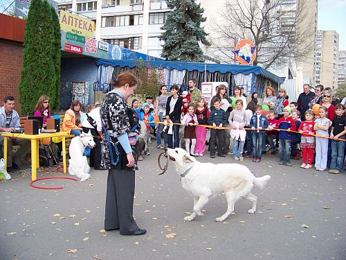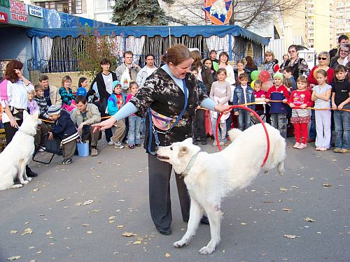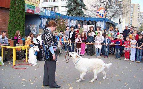 Во второй части программы выступали дрессированные собаки. Белоснежные красивые овчарки выполняли увлекательные трюки: приносили по команде различные предметы, прыгали через кольцо и через высокий турник, а их владельцы рассказывали детям о разных породах собак, о том, как важно правильно воспитывать свою собаку и чему ее можно научить, если ответственно к этому подойти.