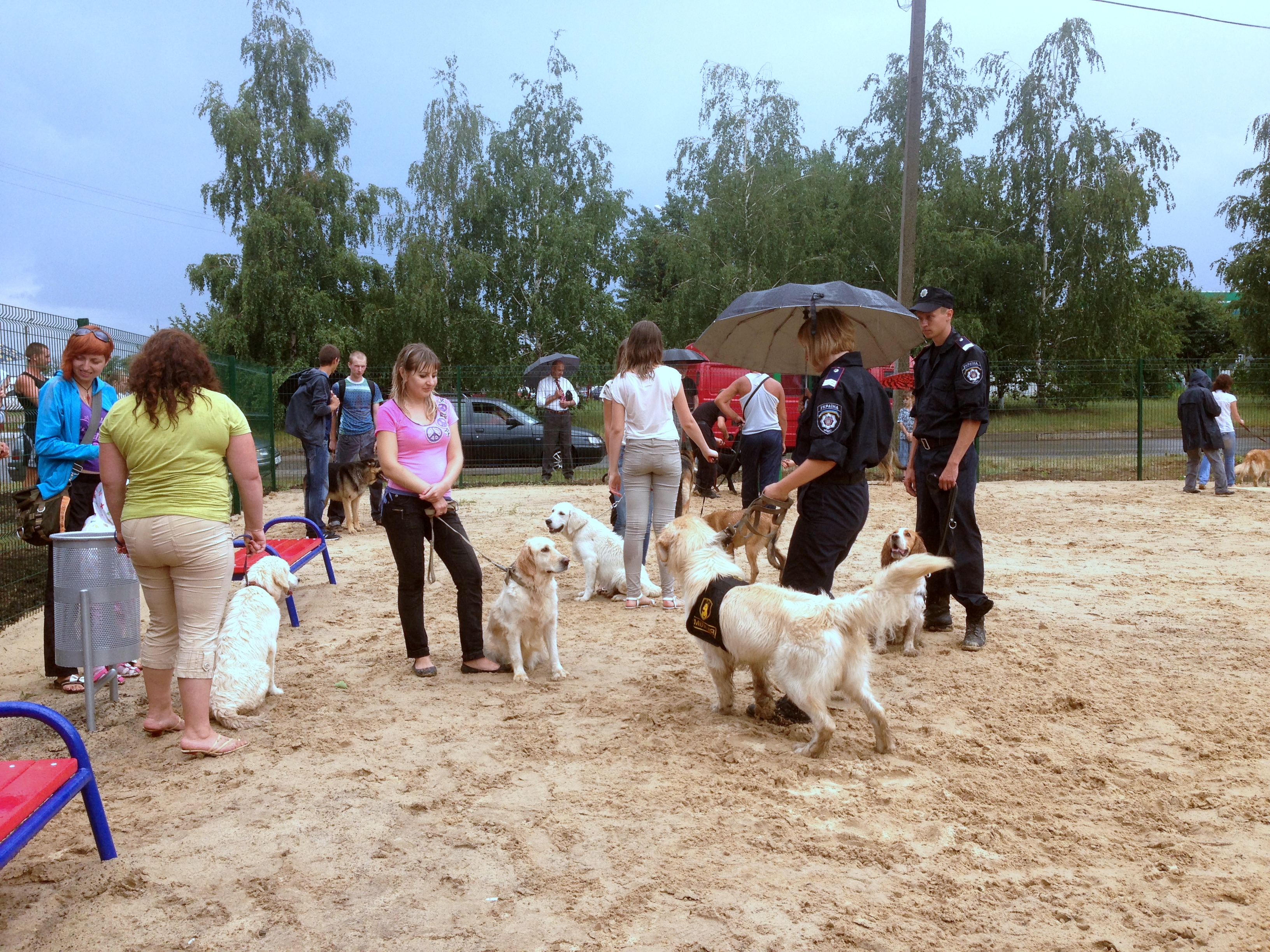 На открытие пришло много владельцев собак с питомцами. Кинологи МВД демонстрировали собравшимся послушание собак. Было интересно, даже начавшийся сильный дождь не помешал, люди не разошлись.