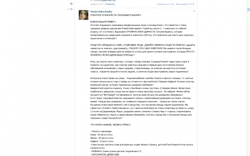 На данном этапе единственное о чем я прошу Вас, это посильная помощь нашим подопечным. Мы совместно с Юлией и Таней опекаем их, но у меня на попечении не только животные из приюта, а еще: 13 котят на Широнинцев, Маша с разрывом связки, помогаю Стивену Иры + старюсь стерилизовать кошек (Абрикоска, кошка со двора Ирины Ковалевой), поэтому я прошу Вас о посильной помощи для кошек из приюта пожалуйста!!!