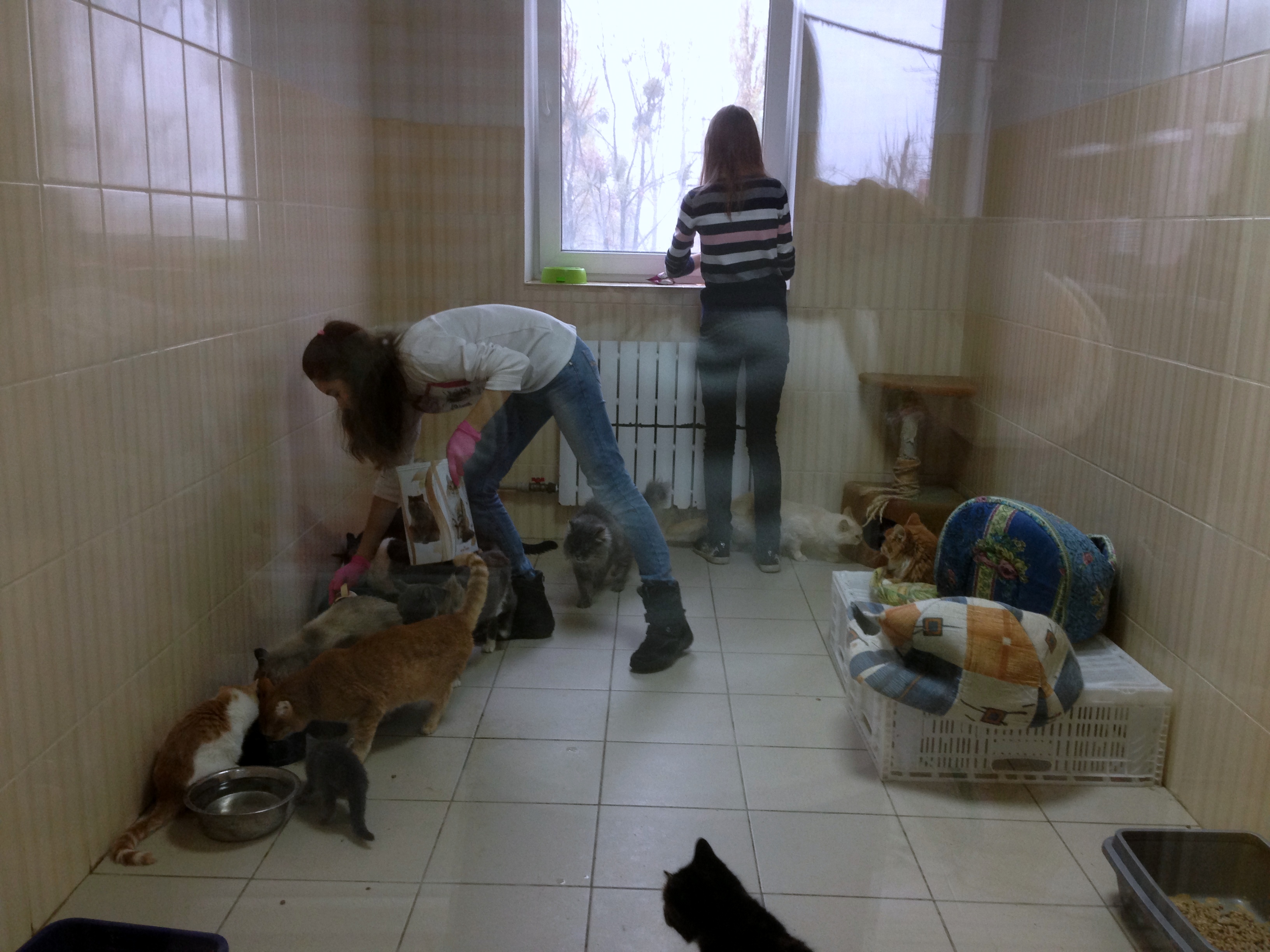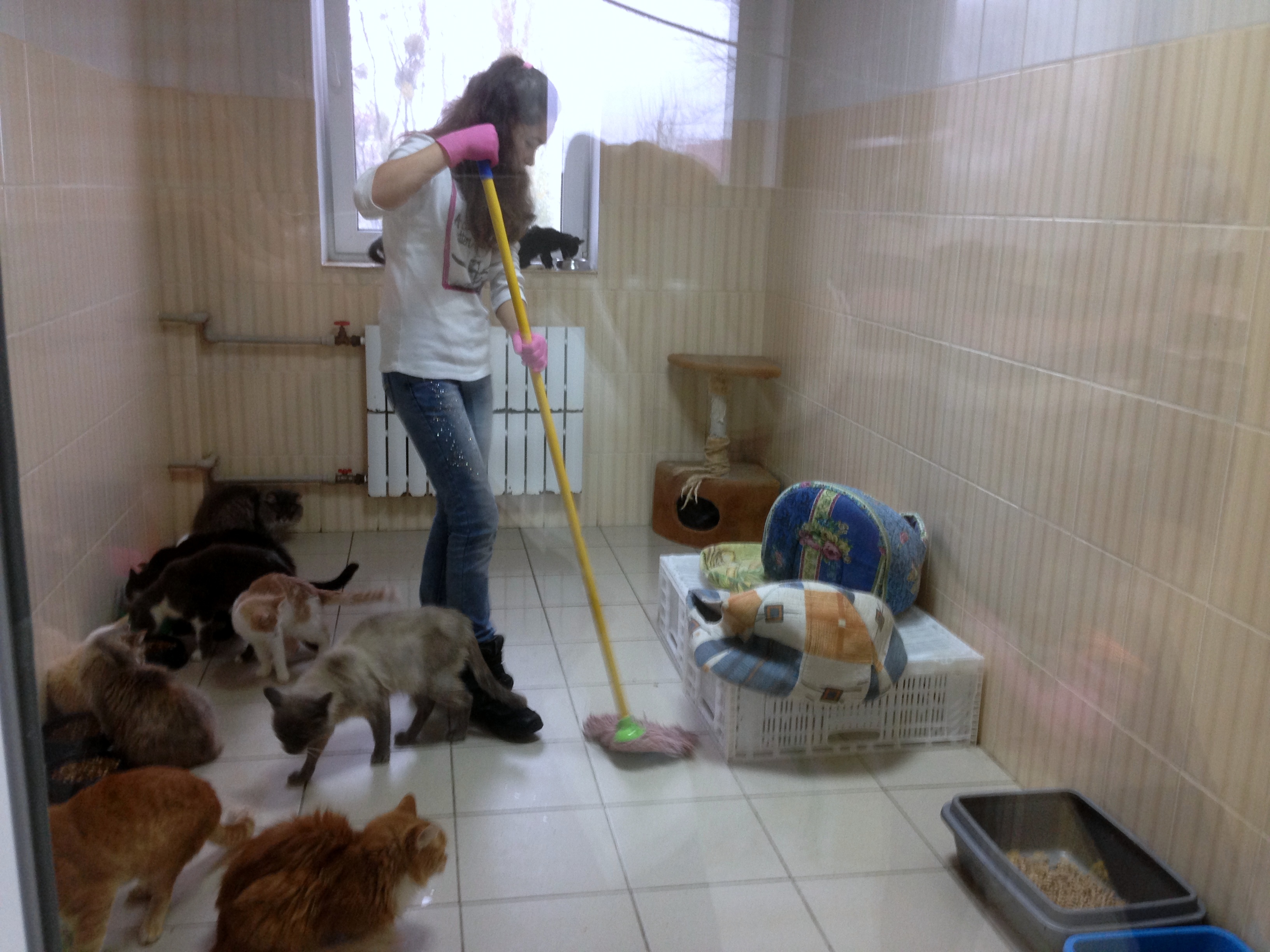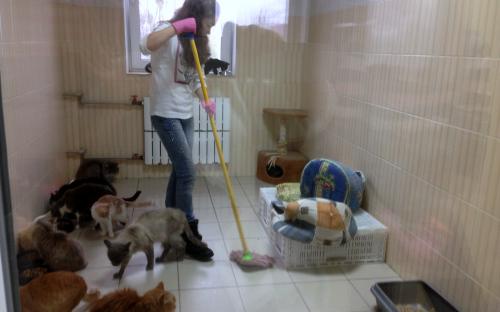 Эти девушки приходят каждые выходные и работаю наравне с врачами и администраторами приюта. Они убирают у кошек, кормят их, гуляют и играют с собаками.