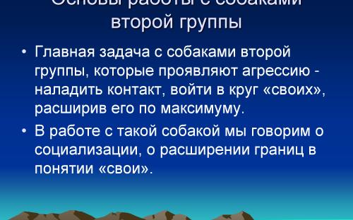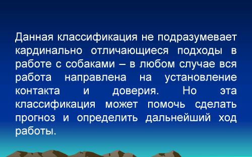 Данная классификация не подразумевает кардинально отличающиеся подходы в работе с собаками – в любом случае вся работа направлена на установление контакта и доверия.Но эта классификация может помочь сделать прогноз и определить ход работы.