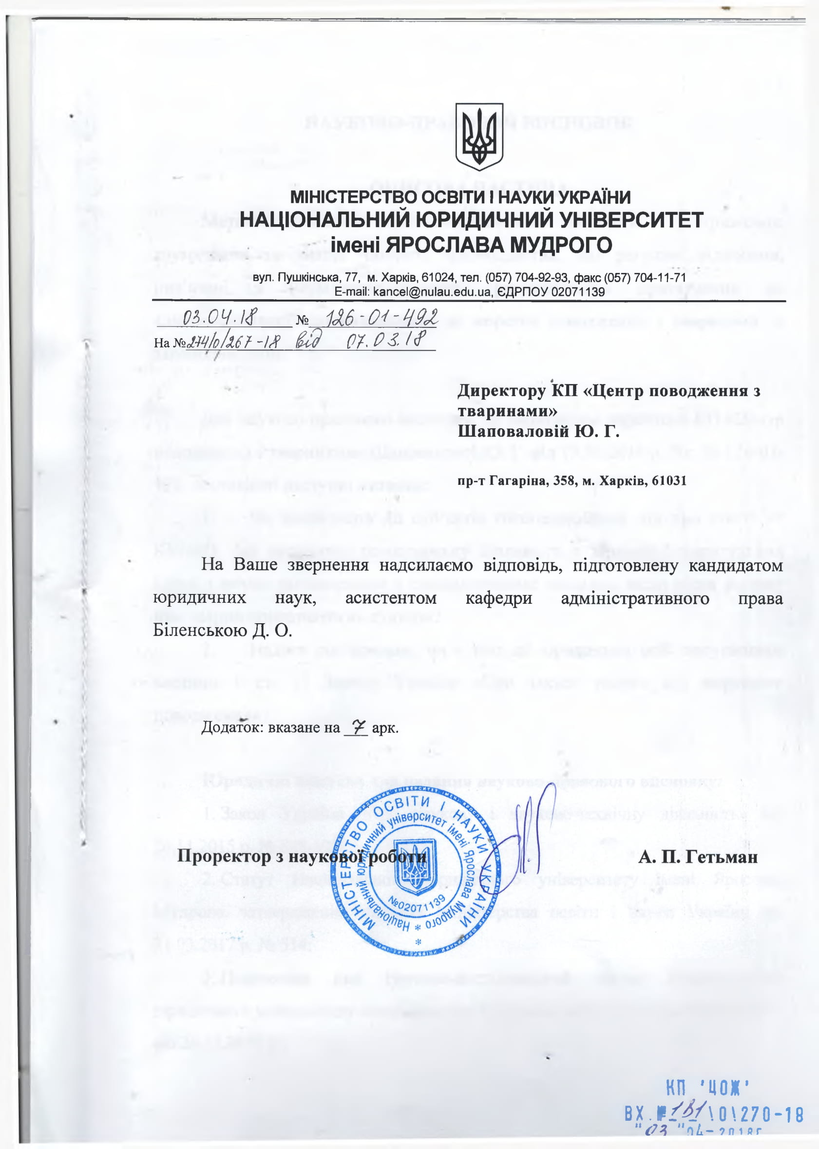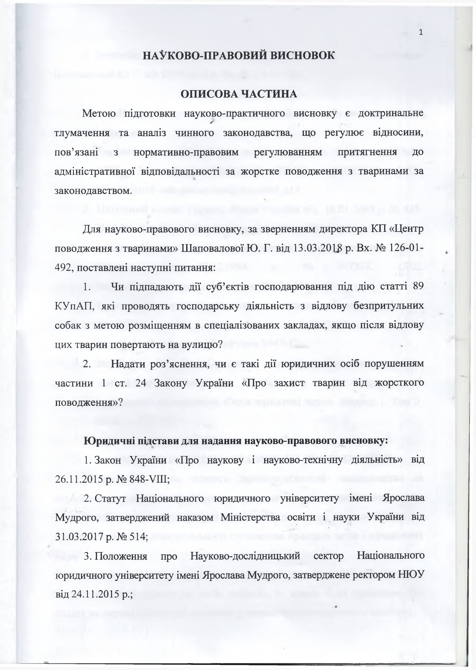 Для научно-правового заключения, по обращению директора КП «Центр обращения с животными» Шаповаловой Ю.Г. от 13.03.2018 г. вх. №126-01-492, поставлены следующие вопросы: