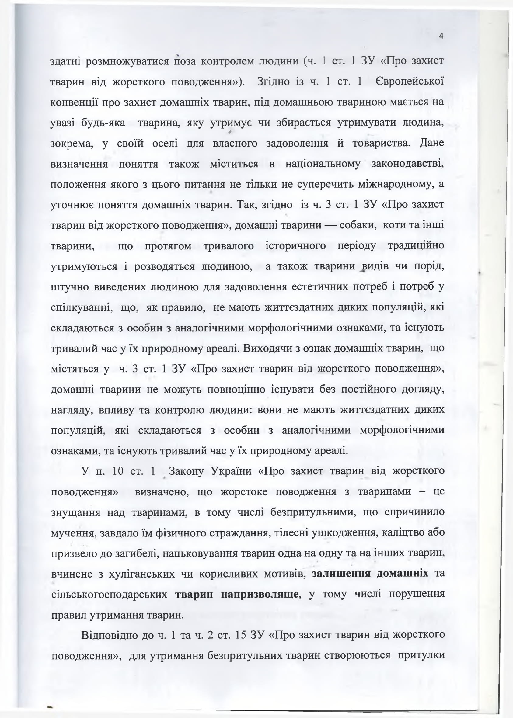 Законом Украины «О защите животных от жестокого обращения» предусмотрено, что бездомные животные - это животные, оставшиеся без присмотра человека или образовавшие полусвободные группировки, способные размножаться вне контроля человека (ч. 1 ст. 1 Закона Украины «О защите животных от жестокого обращения»). Согласно ч. 1 ст.1. Европейской конвенции о защите домашних животных, под домашним животным подразумевается любое животное, которое содержит или собирается содержать человек, в том числе в своем доме в свое удовольствие и для общения. Данное определение понятия также содержится в национальном законодательстве, положения которого по этому вопросу не только не противоречат международному, а уточняют понятие домашних животных. Так, согласно ч. 3 ст. 1 ЗУ «О защите животных от жестокого обращения», домашние животные - собаки, кошки и другие животные, в течение длительного исторического периода традиционно содержатся и разводятся человеком, а также животные видов или пород, искусственно выведенных человеком для удовлетворения эстетических потребностей и потребностей в общении , что, как правило, не имеют жизнеспособных диких популяций, состоящих из особей с аналогичными морфологическими признаками, и существуют длительное время в их естественном ареале. Исходя из признаков домашних животных, содержащихся в ч. 3 ст. 1 ЗУ «О защите животных от жестокого обращения», домашние животные не могут полноценно существовать без постоянного ухода, надзора, влияния и контроля человека: они не имеют жизнеспособных диких популяций, состоящих из особей с аналогичными морфологическими признаками, и существуют длительное время в их природном ареале.