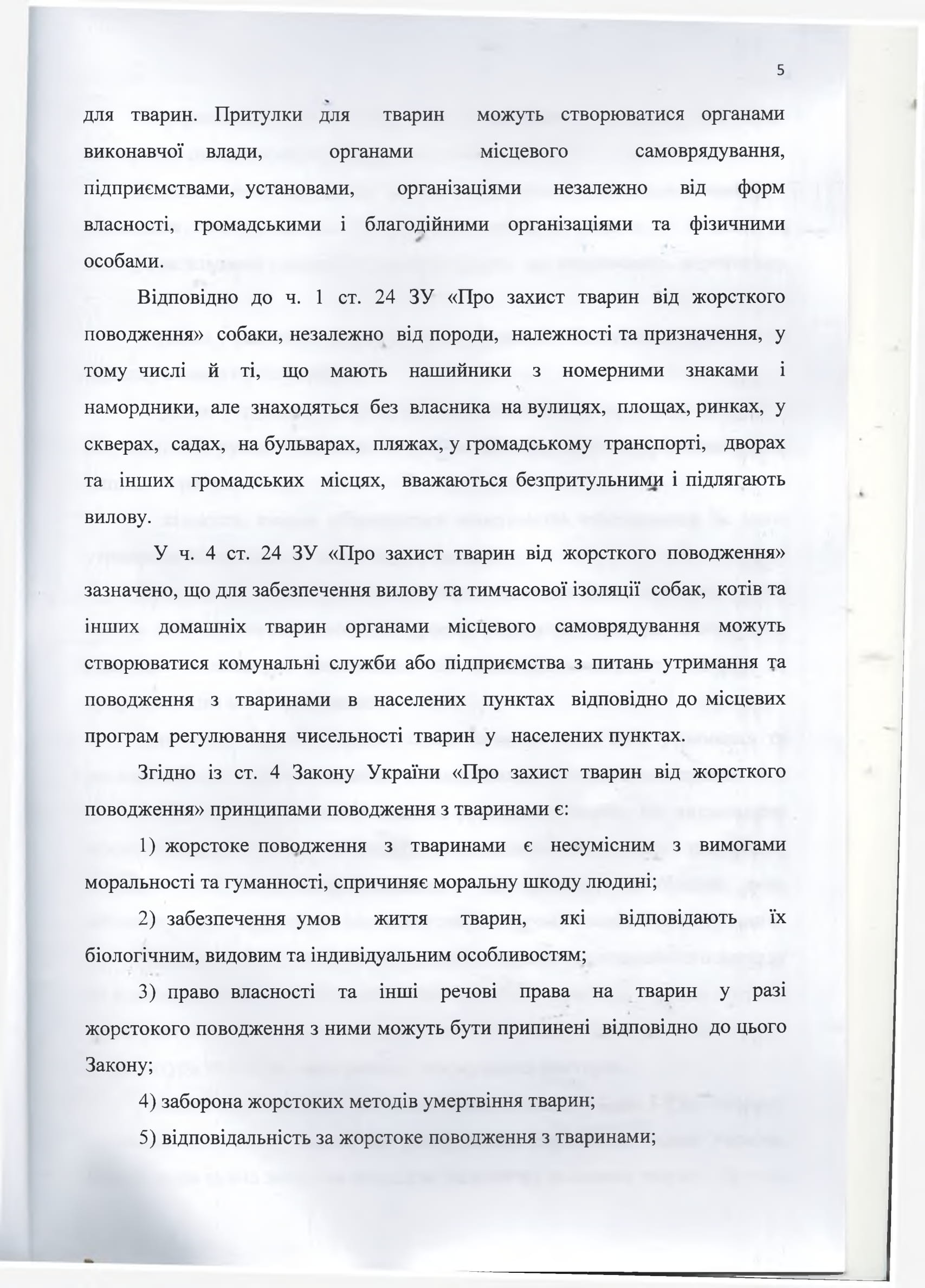 В ч. 4 ст. 24 ЗУ «О защите животных от жестокого обращения» указано, что для обеспечения вылова и временной изоляции собак, кошек и других домашних животных органами местного самоуправления могут создаваться коммунальные службы или предприятия по вопросам содержания и обращения с животными в населенных пунктах в соответствии с местными программами регулирования численности животных в населенных пунктах. Согласно ст.4 Закона Украины «О защите животных от жестокого обращения» принципами обращения с животными являются: