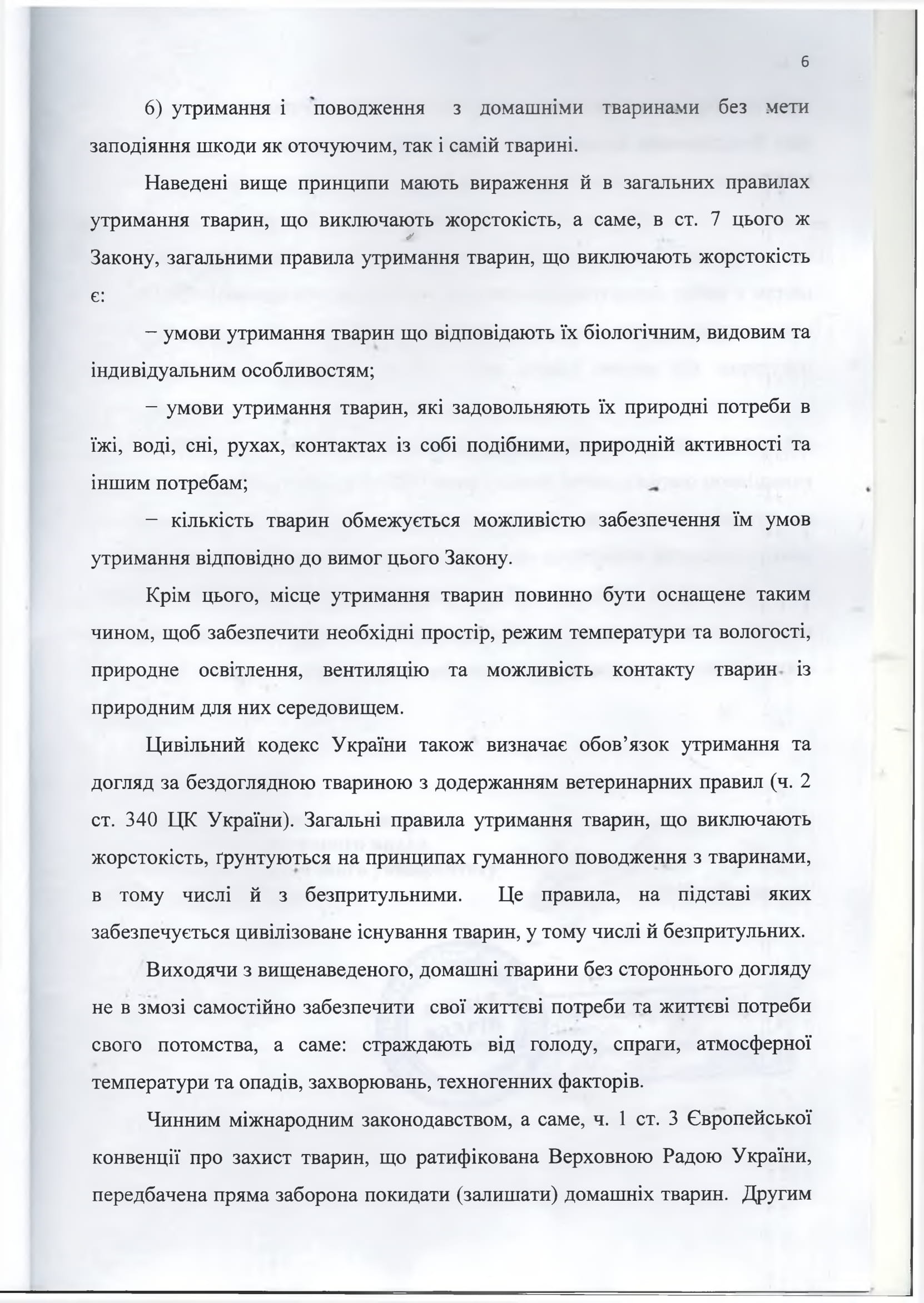 Действующим международным законодательством, а именно: ч. 1 ст. 3 Европейской конвенции о защите животных, которая ратифицирована Верховной Радой Украины, предусмотрен прямой запрет покидать (оставлять) домашних животных. Вторым принципом благополучия животных является запрет вызывать ненужную боль, страдания или угнетение. Именно поэтому цивилизованный европейский мир выходит из описанного принципа (правила) - домашние животные не могут быть на улицах «сами по себе», оставленные на произвол судьбы покинутые и заброшенные.